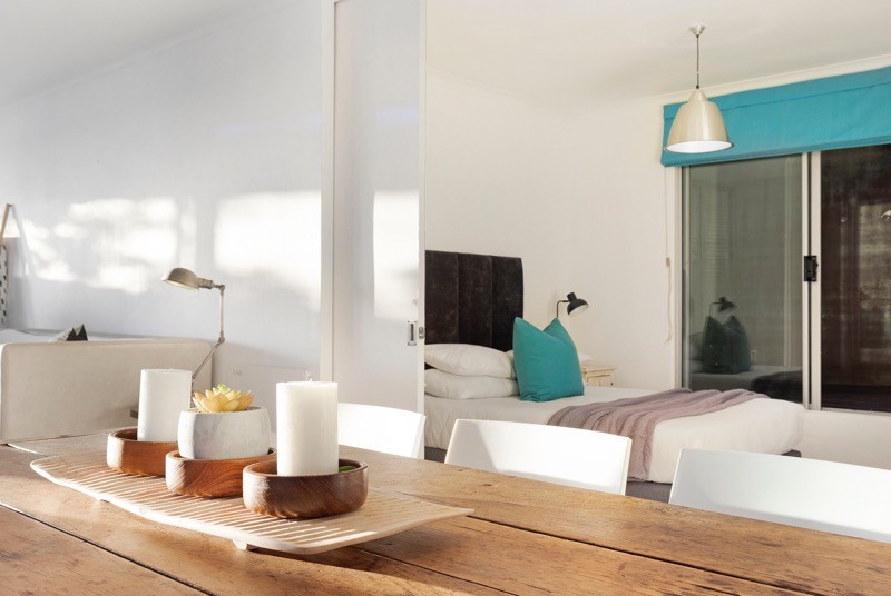 Large doors open onto an expansive patio where outdoor living truly comes to life. Here, guests can lounge beside the sparkling saltwater swimming pool, enjoy meals at the outdoor dining table, or relax under the shade while overlooking the lush green garden.