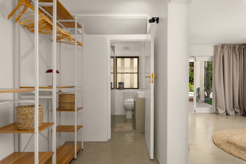 Upstairs and across the bedroom wing, the atmosphere remains calm and understated. Clean finishes and generous proportions enhance the sense of space, while multiple outdoor areas — including an upper terrace with gas braai — create a setting well suited to entertaining or quiet evenings beneath the mountains.