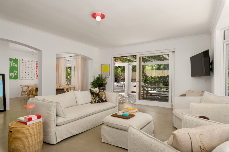 The main living area centres around a welcoming lounge with a fireplace and a large dining table suited to long, relaxed meals. Sliding doors encourage seamless flow to the outdoor spaces, where a sparkling pool and shaded seating invite slow afternoons under the Hout Bay sun.