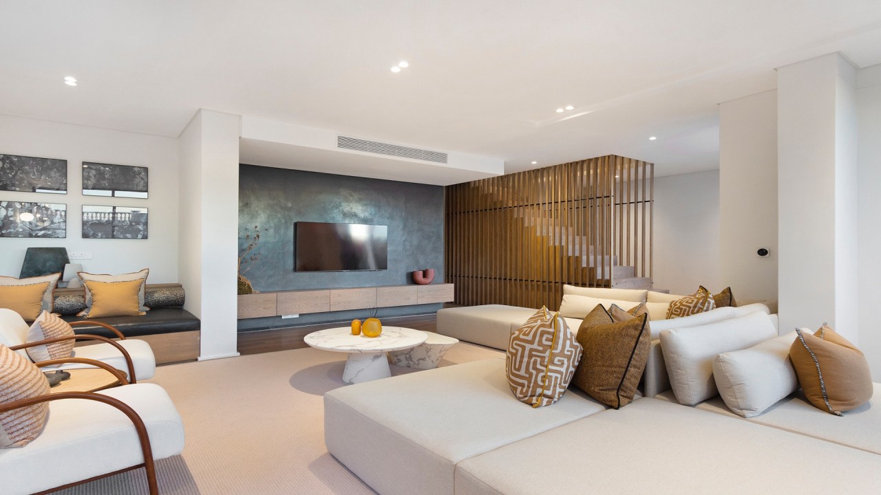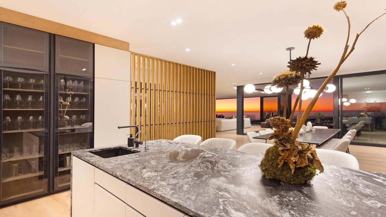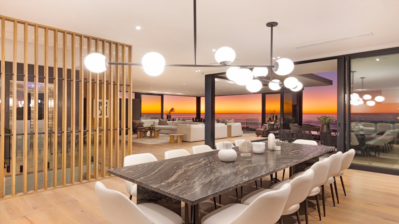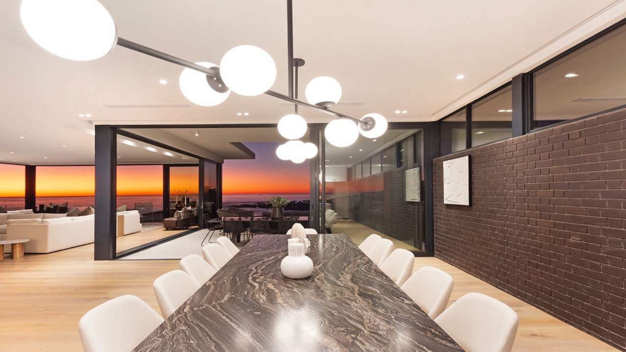 Designed for both relaxation and entertaining, the home spans three levels connected by both stairs and a lift. The main entertainment level features open-plan living spaces that flow seamlessly from the lounge to the dining area and kitchen, all overlooking the Atlantic Ocean through expansive windows. The large outdoor terrace invites guests to dine alfresco or relax in the outdoor lounge while soaking in the spectacular sea views.
