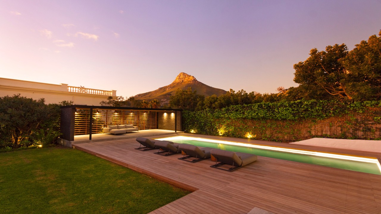 Downstairs, the villa opens onto a beautiful garden and private swimming pool area complete with sun loungers and a pool house with BBQ facilities — the perfect space for relaxed afternoons in the Cape Town sun.