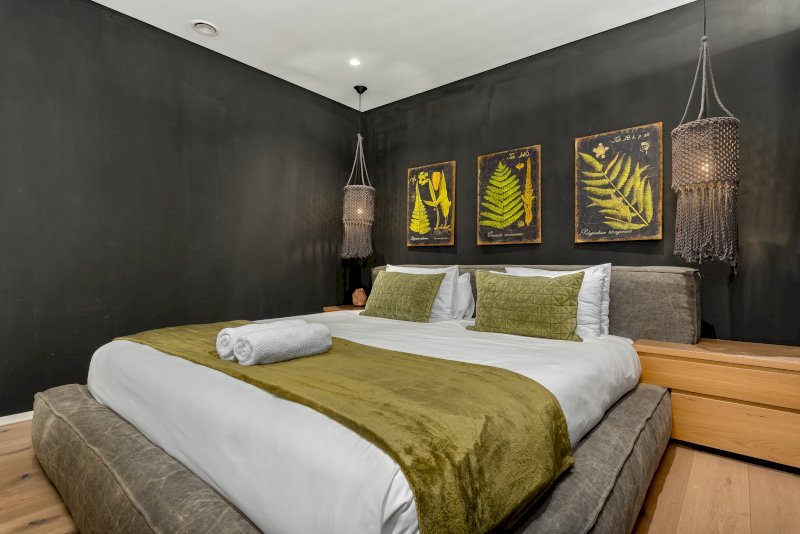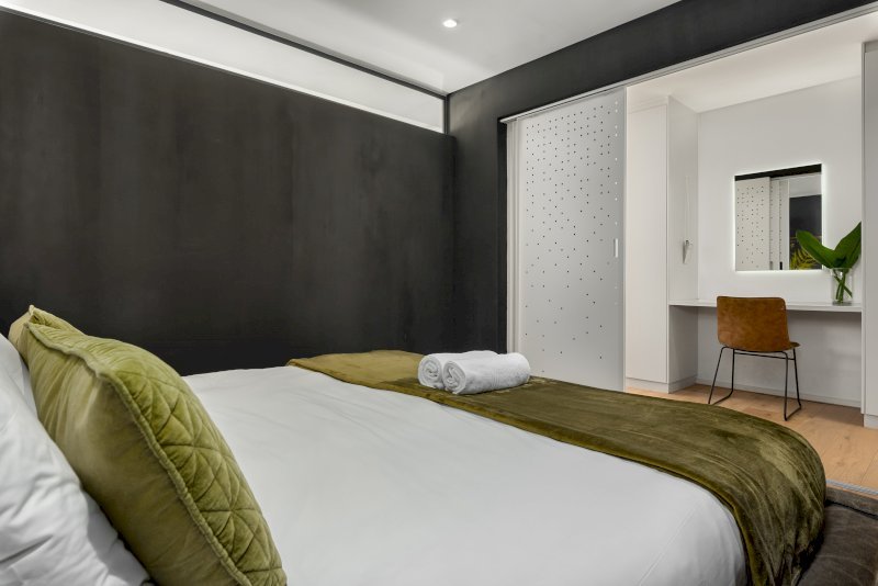 Defined by clean lines and an industrial-inspired finish, this designer apartment blends warmth with contemporary style. The open-plan living area flows seamlessly from the kitchen to the lounge and dining space, extending onto a private balcony with expansive views.