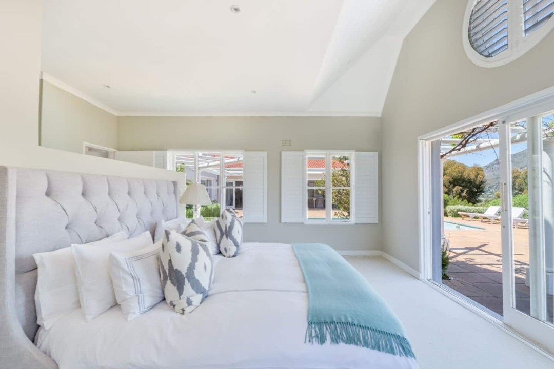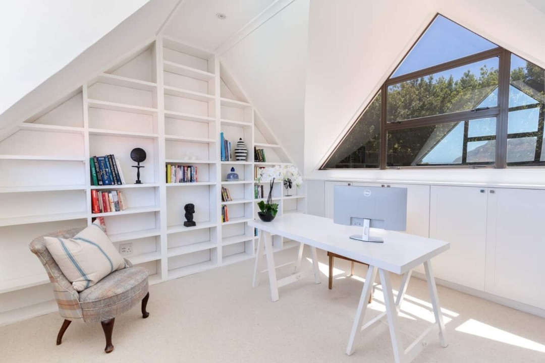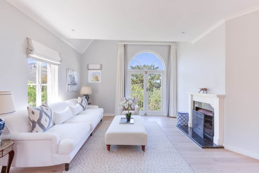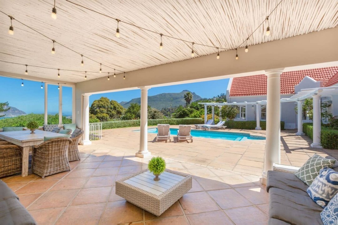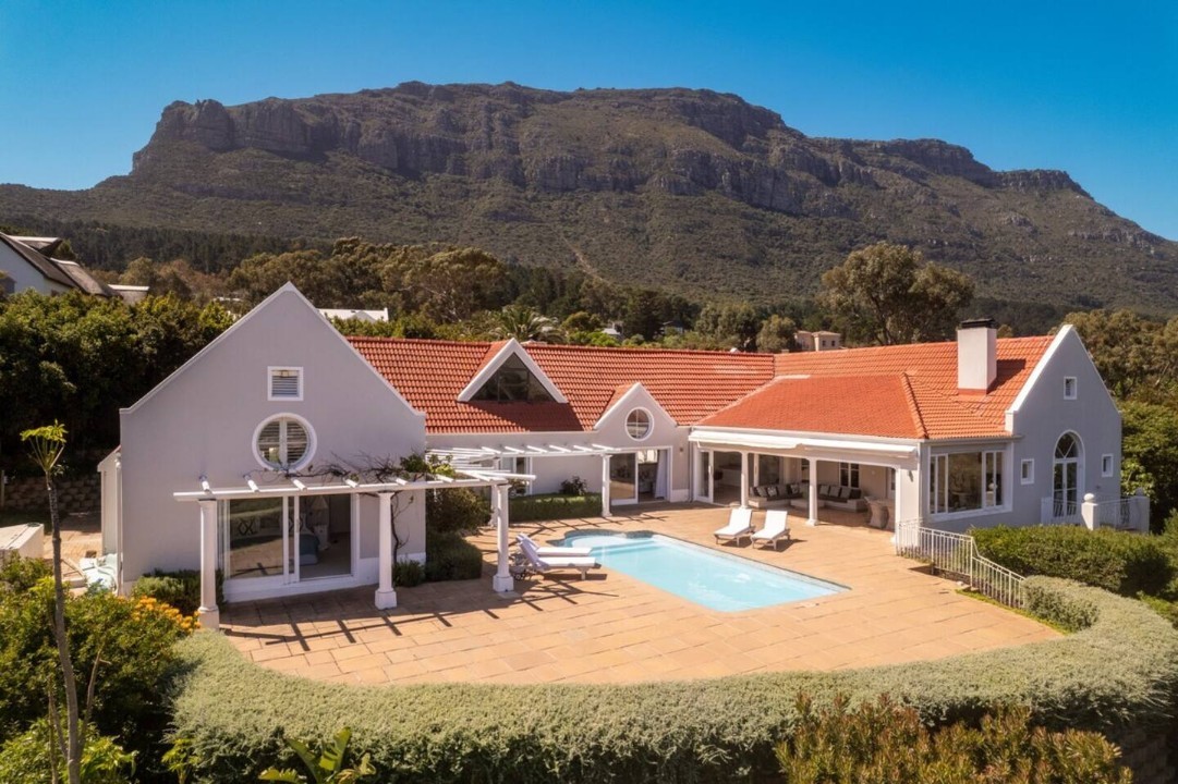 The house has been configured to provide the perfect setting for an extended family, providing a main house and additional, self-contained studio. In the principal house on the ground floor is a magnificent open-plan living room, comprising lounge, dining room and immaculate, designer kitchen. Well-placed windows afford light and picturesque views from multiple spots, and doors open onto a beautiful terrace, which in turn opens onto the lawned garden and an ocean facing pool. There is a separate TV lounge and both living areas have a fireplace, perfect for cosy evenings. The bedroom wing is no less impressive, containing the master suite and three more bedrooms, all with build-in storage. The master bedroom has an en-suite bathroom and there is an elegant family bathroom, and both master and second bedroom have doors opening to the outside. The house also has a study, making this the perfect property in which to combine work with relaxation. The studio flatlet is finished to the same, notable quality, and offers a cosy lounge, kitchenette and double bedroom, en-suite. Fixtures, finishes and decor are of the highest quality throughout, with the pale wood flooring, windows and subtle palette creating a calm, Scandinavian ambiance. The property is set in large, mature grounds, and includes, along with the pool, a sunken trampoline, lawns and umpteen corners to relax or play in – the perfect family house. Views over the bay and of the mountain create a glorious backdrop. There is large double garage, plus a carport and additional parking, and the property is walled and secure, with beams, CCTV and alarm. Hout Bay itself offers multiple amenities – a range of cafes and restaurants, shops, a market and harbour – and it is extremely well-positioned for accessing the seaboard, Cape Town and Constantia. It really is hard to overstate the quality of this genuinely lovely house, which offers the most perfect setting and accommodation for the discerning visitor.