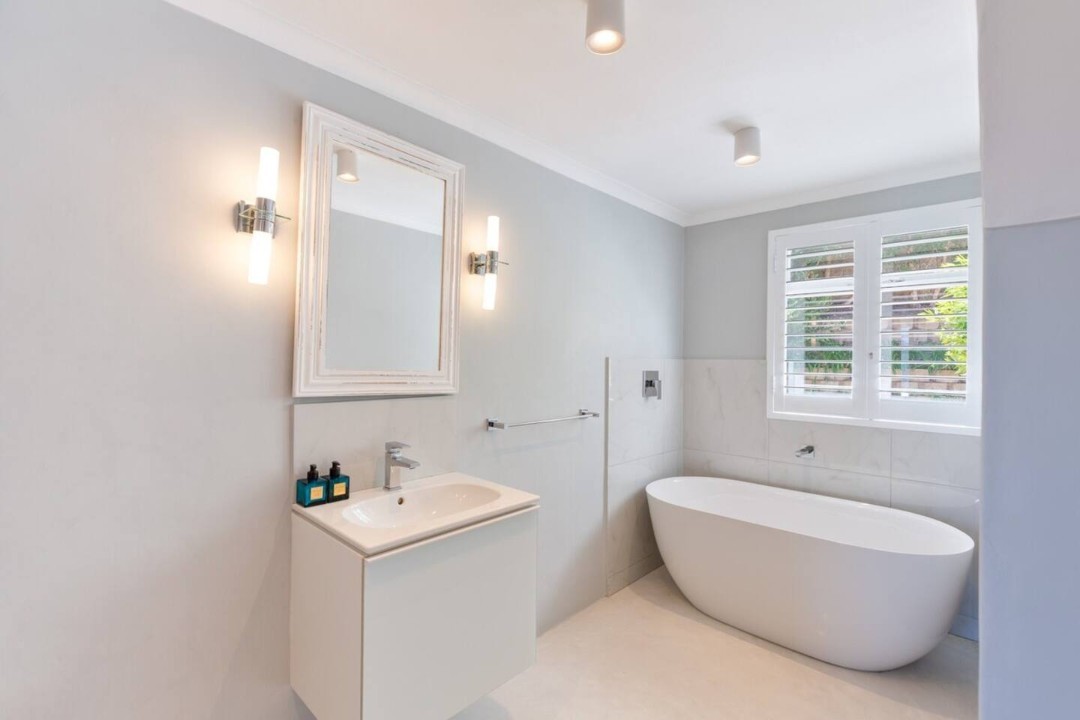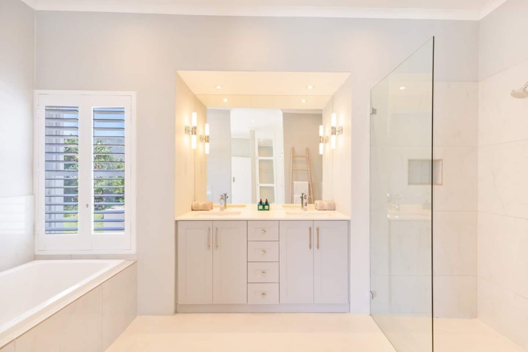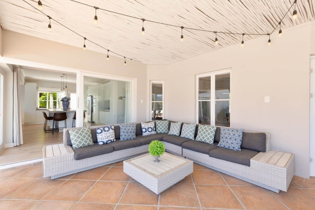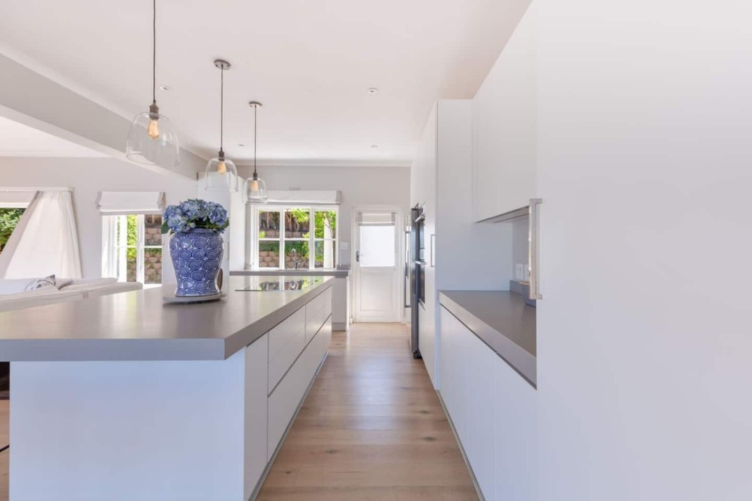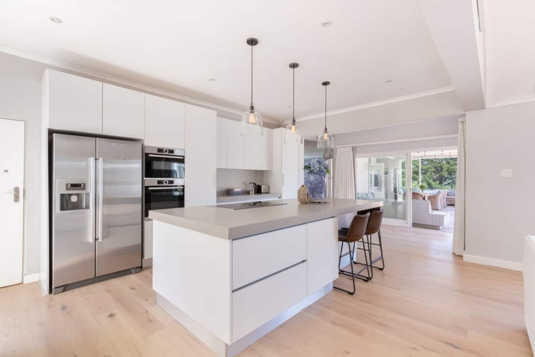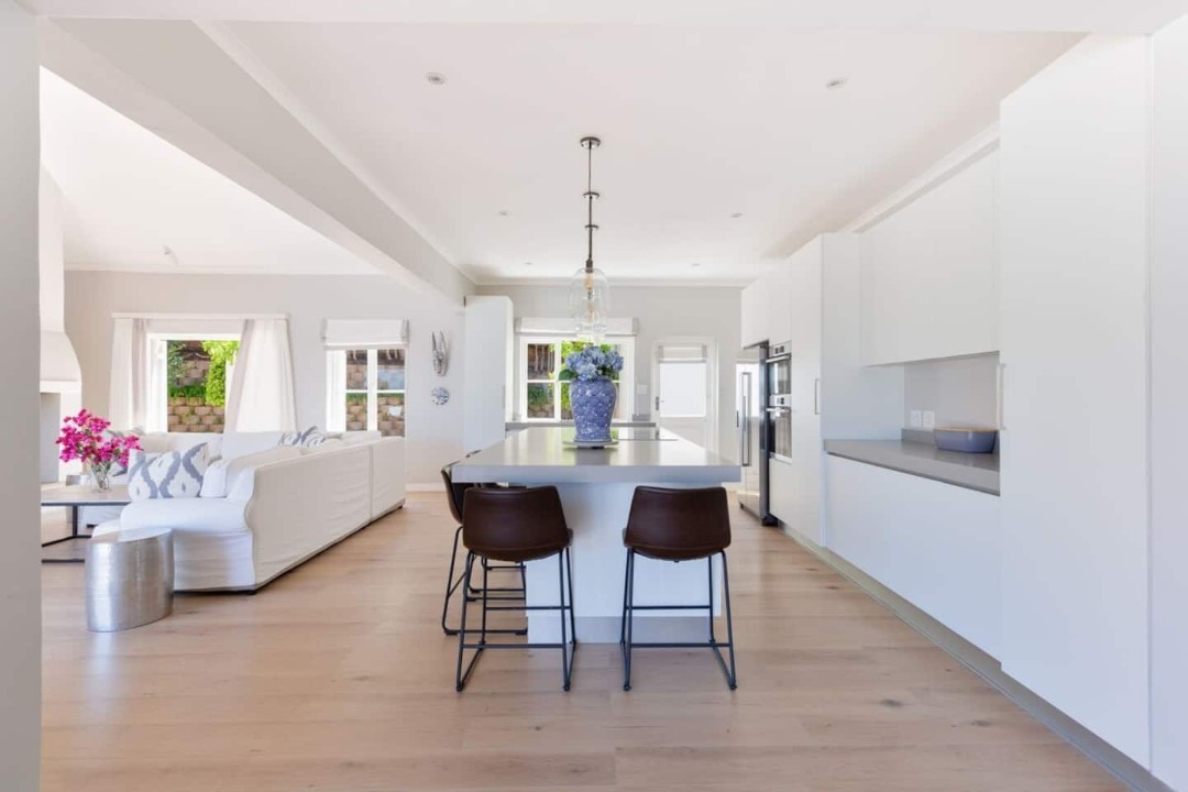 The house has been configured to provide the perfect setting for an extended family, providing a main house and additional, self-contained studio. In the principal house on the ground floor is a magnificent open-plan living room, comprising lounge, dining room and immaculate, designer kitchen. Well-placed windows afford light and picturesque views from multiple spots, and doors open onto a beautiful terrace, which in turn opens onto the lawned garden and an ocean facing pool. There is a separate TV lounge and both living areas have a fireplace, perfect for cosy evenings. The bedroom wing is no less impressive, containing the master suite and three more bedrooms, all with build-in storage. The master bedroom has an en-suite bathroom and there is an elegant family bathroom, and both master and second bedroom have doors opening to the outside. The house also has a study, making this the perfect property in which to combine work with relaxation. The studio flatlet is finished to the same, notable quality, and offers a cosy lounge, kitchenette and double bedroom, en-suite. Fixtures, finishes and decor are of the highest quality throughout, with the pale wood flooring, windows and subtle palette creating a calm, Scandinavian ambiance. The property is set in large, mature grounds, and includes, along with the pool, a sunken trampoline, lawns and umpteen corners to relax or play in – the perfect family house. Views over the bay and of the mountain create a glorious backdrop. There is large double garage, plus a carport and additional parking, and the property is walled and secure, with beams, CCTV and alarm. Hout Bay itself offers multiple amenities – a range of cafes and restaurants, shops, a market and harbour – and it is extremely well-positioned for accessing the seaboard, Cape Town and Constantia. It really is hard to overstate the quality of this genuinely lovely house, which offers the most perfect setting and accommodation for the discerning visitor.