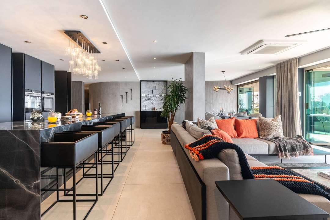From the secure parking garage, a short stairway leads you into an open-plan living area where style meets functionality. The space features contemporary furnishings and striking artwork, while large glass doors fold away to reveal an expansive, shaded balcony. Outfitted with a jacuzzi, comfortable seating, and sun loungers, the balcony is the perfect spot to take in the stunning 180-degree views of the ocean.