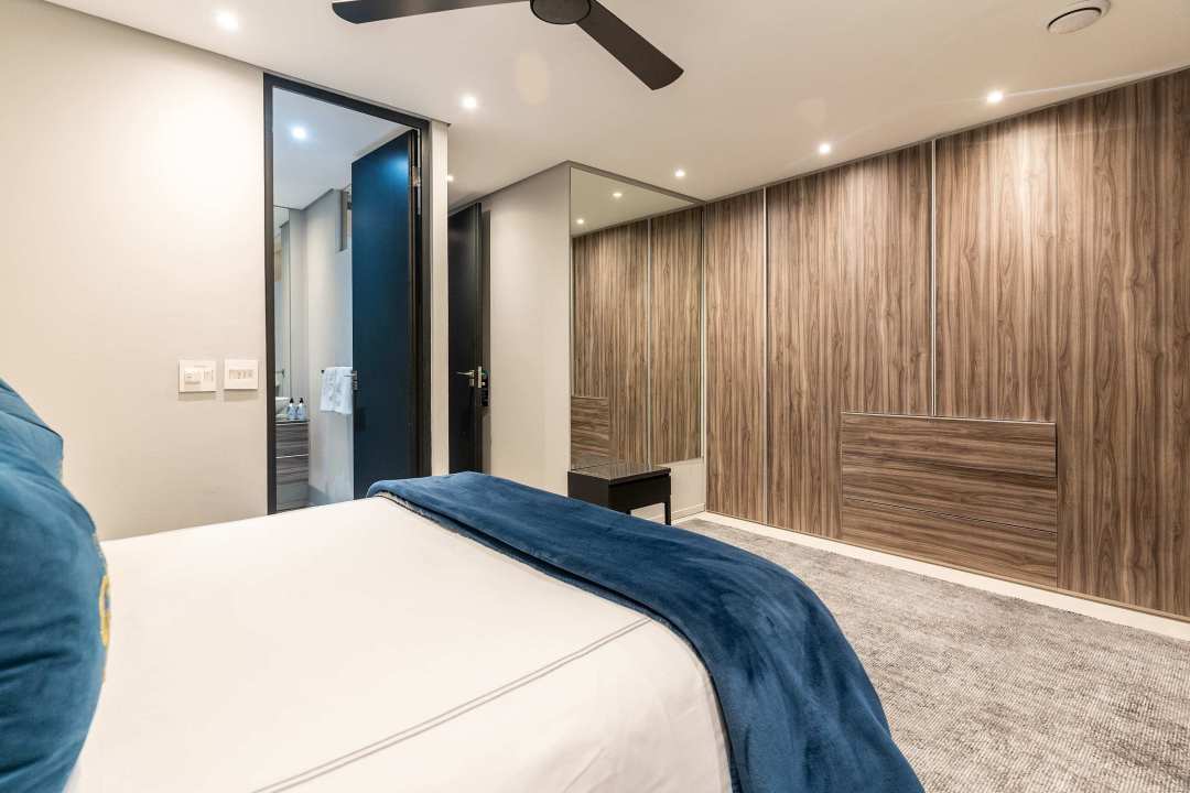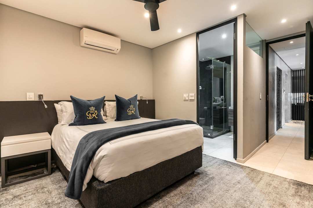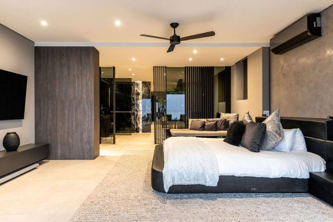 The third bedroom, also with a queen-sized bed, includes air-conditioning, a smart TV, built-in wardrobes, and a well-appointed en-suite bathroom with a spacious rain shower.