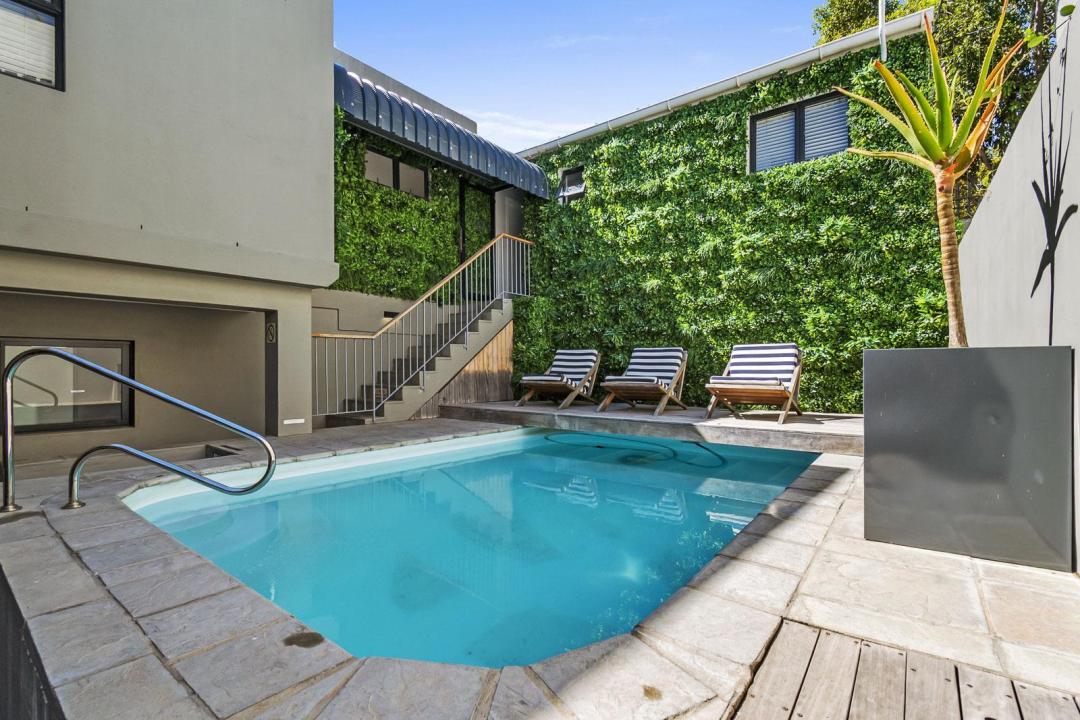 A tranquil courtyard with a saltwater splash pool provides a refreshing escape on warm Cape Town days. Comfortable seating and calm surroundings make it the perfect place to unwind between adventures.