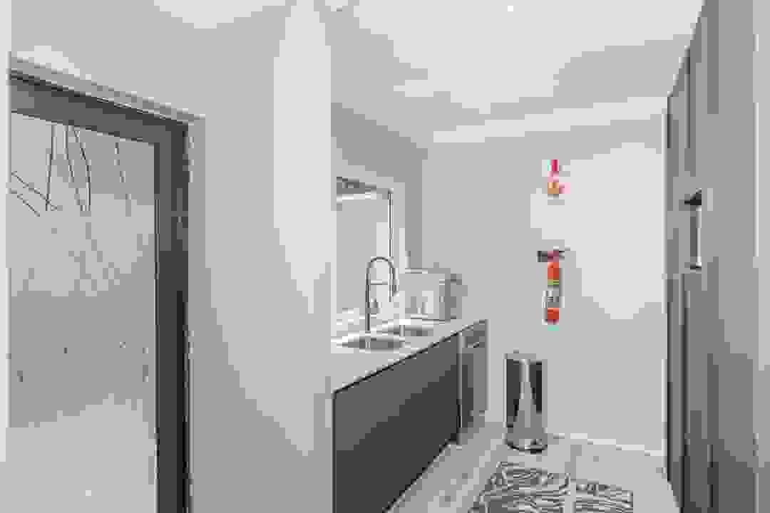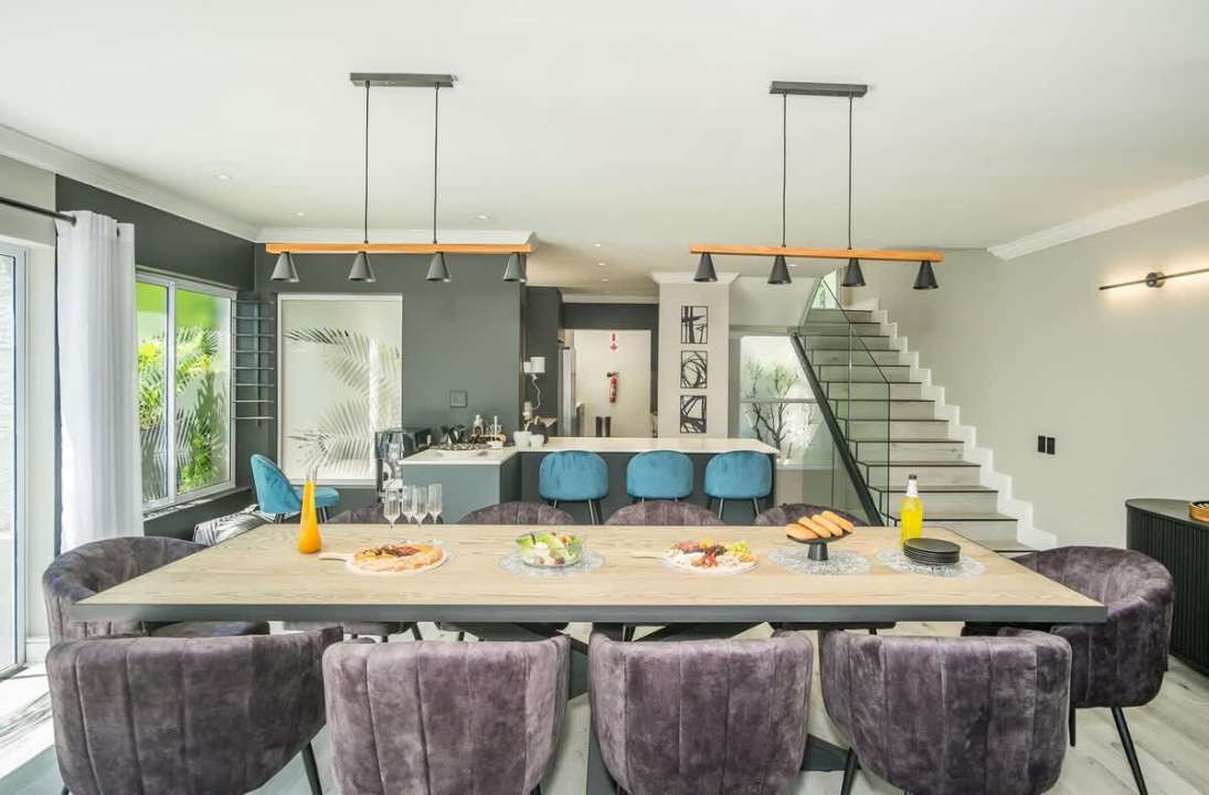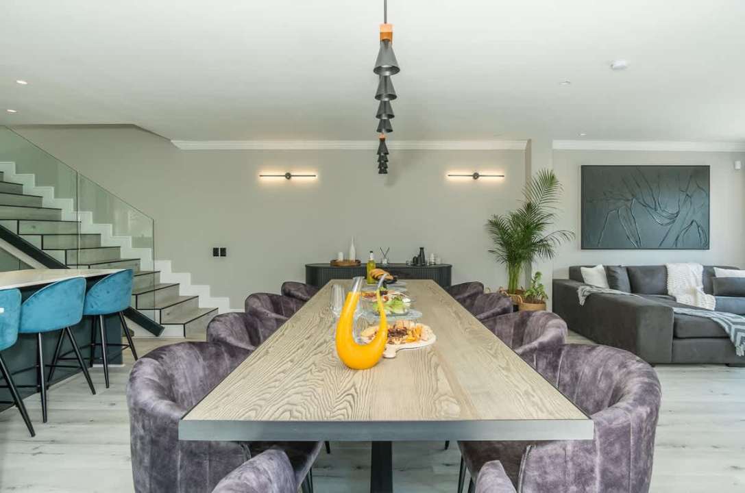 The entrance level welcomes you with a cosy cinema room featuring a large TV, nostalgic popcorn machine, retro mini drinks fridge, and sumptuous seating, perfect for cozy evenings. On the first level, the open-plan living area exudes elegance, with bespoke furnishings, and direct access to the pool deck. The dining space for eight and a gourmet kitchen—complete with premium appliances, a Nespresso machine, and a dedicated scullery—make entertaining an effortless pleasure.