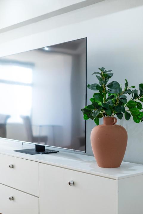 The open-plan living and dining area is designed for easy, everyday living. Comfortable seating for four, a TV, and a work-friendly desk create a versatile space, while the dining table seats six for relaxed meals or entertaining. Large windows invite in natural light and showcase partial sea, mountain, and stadium views.
