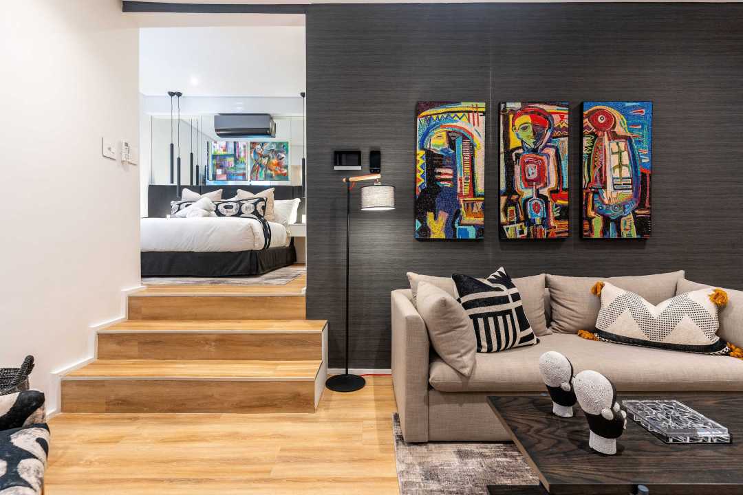 The second level is designed for fun, comfort, and connection. It’s the heart of the villa’s entertainment space, where you can kick back and enjoy everything the home has to offer. The informal lounge is cozy and welcoming, with colourful artwork, soft seating, and a large-screen TV – perfect for movie nights or lazy afternoons.
