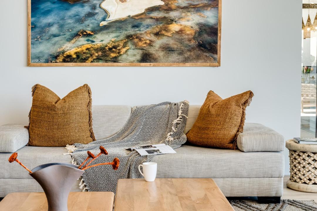 The open-plan lounge and dining area form the heart of the home — a sophisticated yet inviting space complete with plush seating, gas fireplace, air-conditioning, and uninterrupted ocean views. Whether entertaining guests or enjoying a quiet evening in, the villa offers a relaxed yet elevated atmosphere throughout.