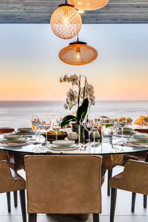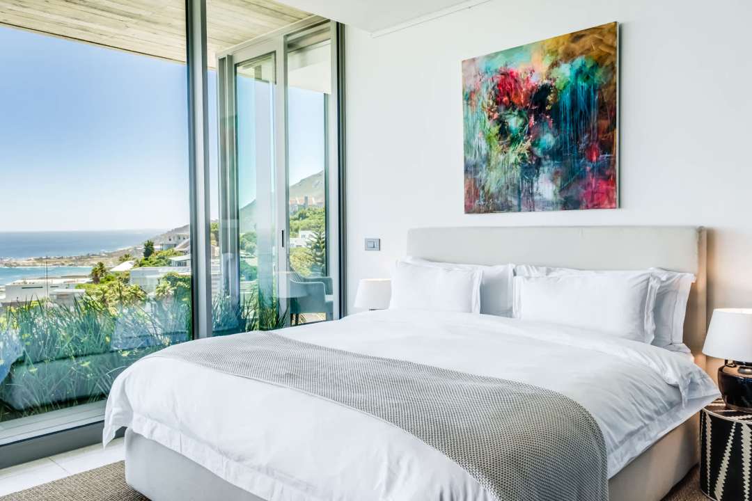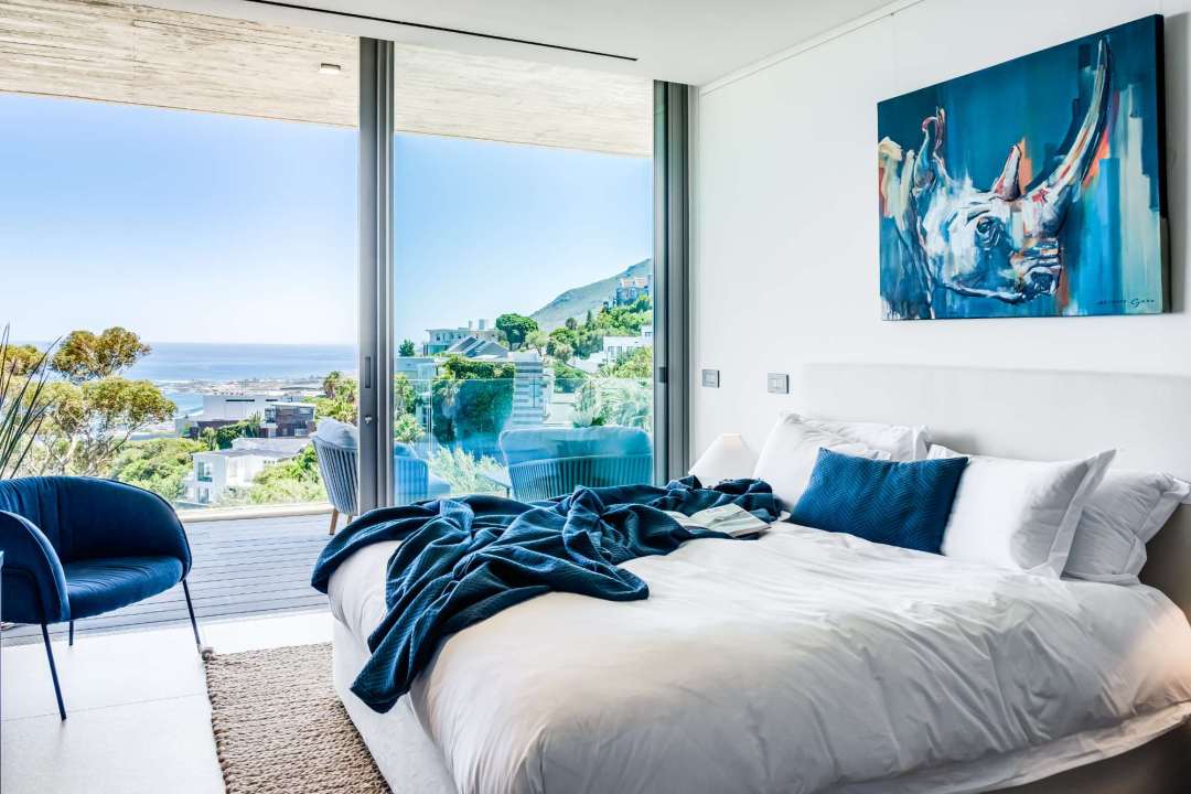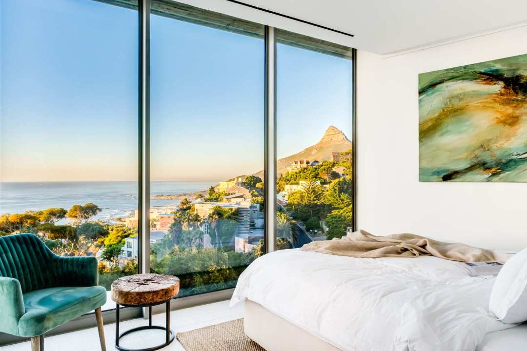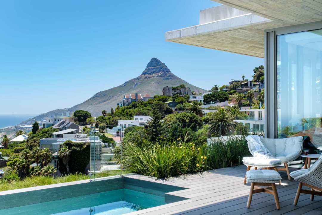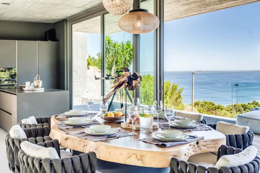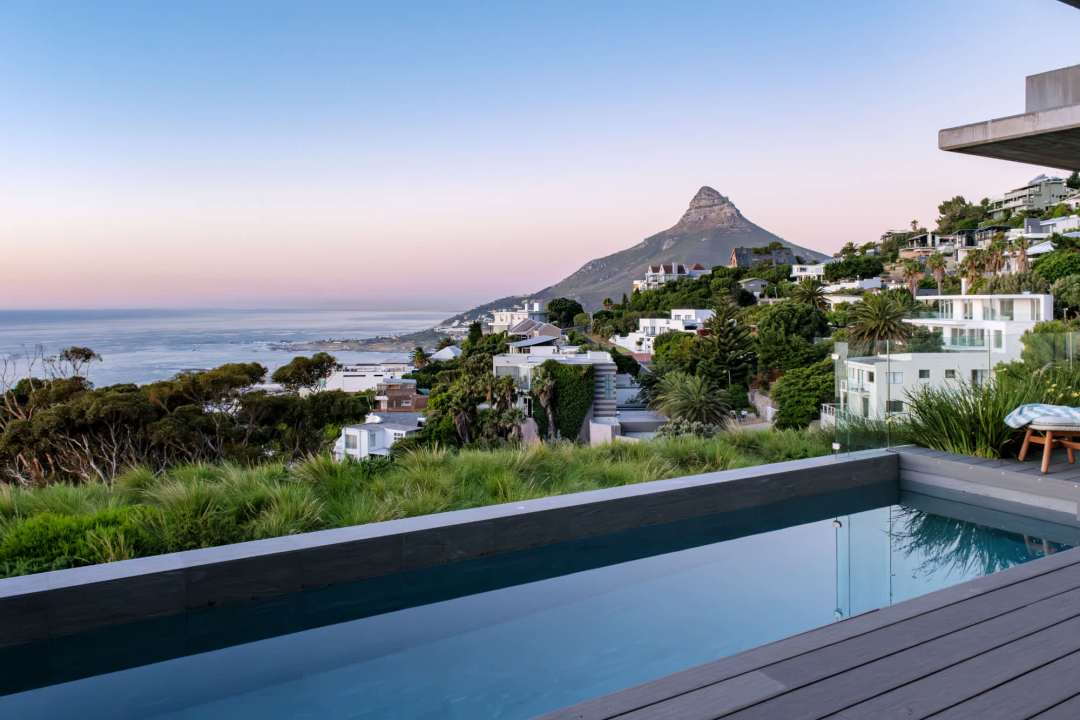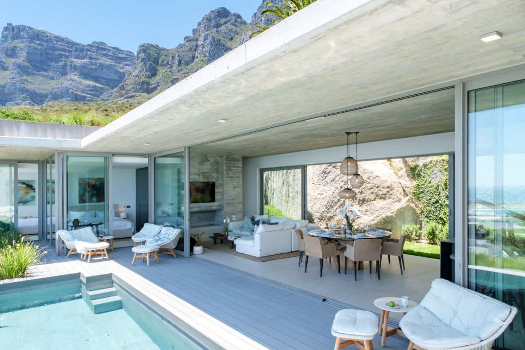 This contemporary and luxurious villa is nestled in the exclusive suburb of Camps Bay and offers sweeping views of the Atlantic Ocean and Lion’s Head. The property consists of two separate three-bedroom apartments, which can be booked individually or together to create a spacious six-bedroom home. A lift connects both levels; when rented separately, each apartment remains completely private. Both offer three bedrooms, three bathrooms, an open-plan living and dining area with fireplace, a modern kitchen, balcony, and a private pool. There is also a gym available for guests use. Please note: the downstairs dining area seats a maximum of 10 guests. It is therefore ideal for groups happy to share a beautiful space or dine across two separate areas. Each bedroom is air-conditioned, en-suite, and tastefully furnished with luxurious finishes. All rooms feature in-built speakers, so you can enjoy your own music throughout the villa. With spectacular views and elegant interiors, this is the perfect setting for a memorable holiday.