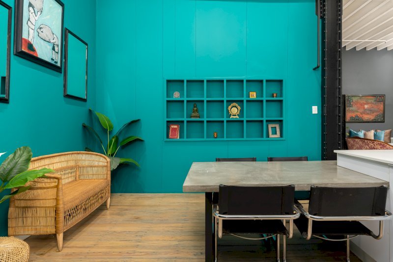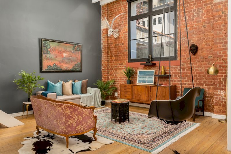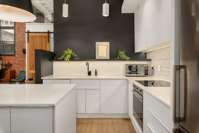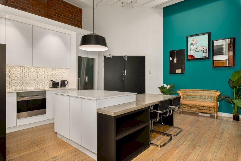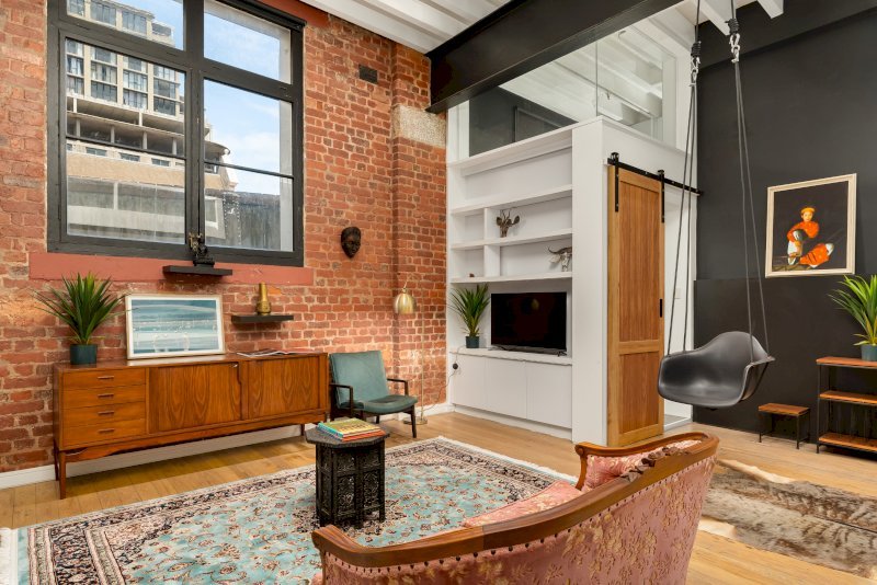 Defined by volume and light, this loft captures the essence of urban living. The open-plan interior features exposed architectural elements and a seamless flow between kitchen, dining, and lounge areas. Large windows invite natural light into the space, enhancing its contemporary industrial aesthetic.