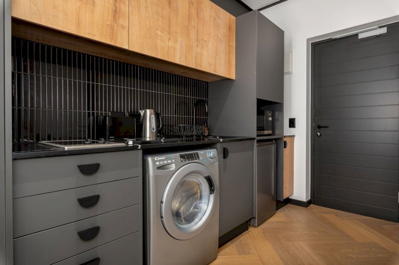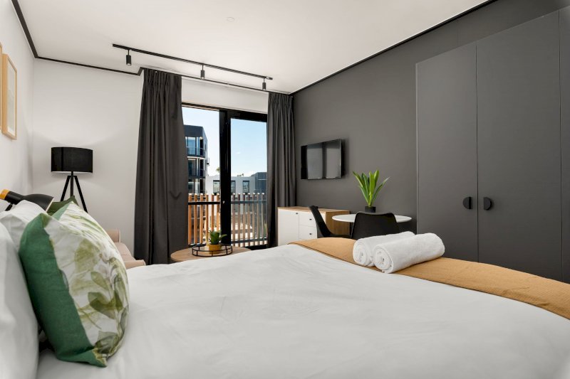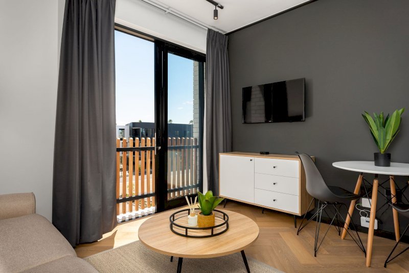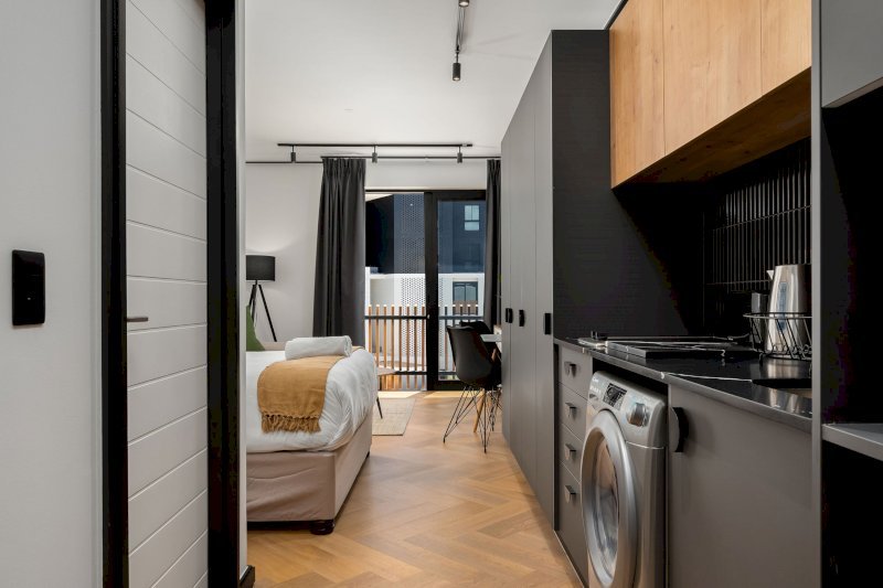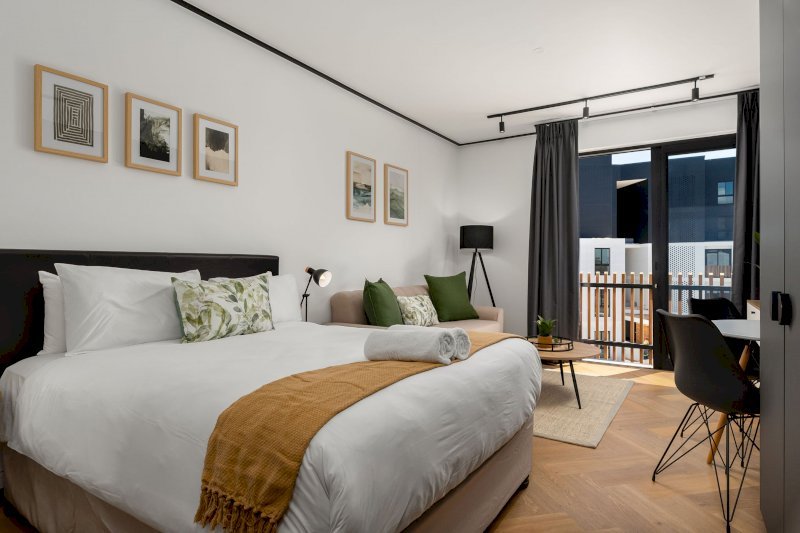 The apartment is thoughtfully decorated with flair, creating a warm and inviting space ideal for couples, solo travellers, or business guests. The open-plan layout allows for easy living, with a comfortable lounge flowing seamlessly into a fully equipped kitchen — perfect for preparing meals or relaxing after a productive day.