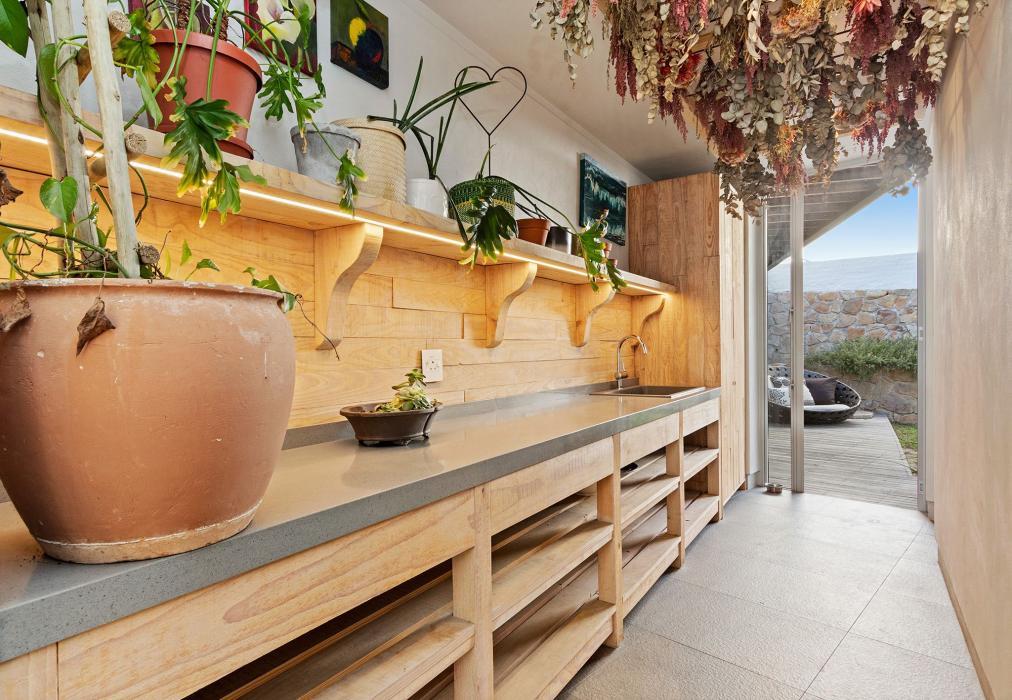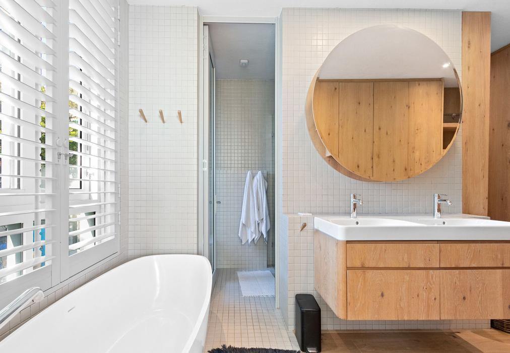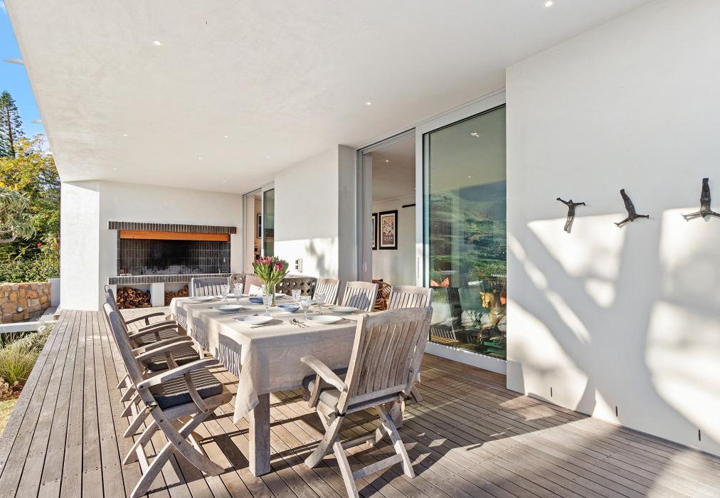 Outdoors, a spacious wooden deck and lush private garden invite sun-soaked afternoons and starlit evenings. Lounge by the swimming pool, enjoy a meal beside the outdoor fireplace, or simply take in the stillness of the mountain backdrop.