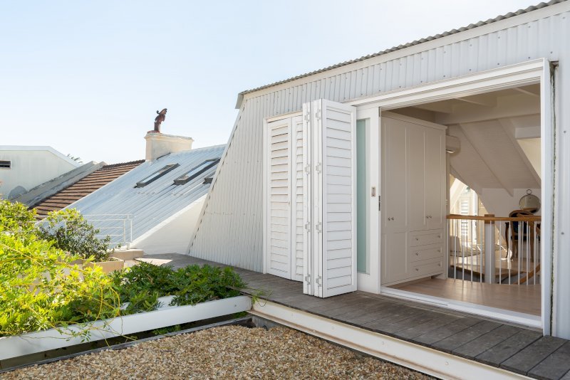 The ground floor transitions effortlessly from the lounge and dining area into a fully equipped kitchen, which opens onto a private courtyard with an outdoor shower — ideal after time spent along the Atlantic coastline. Upstairs, the loft-style master suite is defined by whitewashed ceilings and expansive windows, creating an airy retreat filled with natural light.