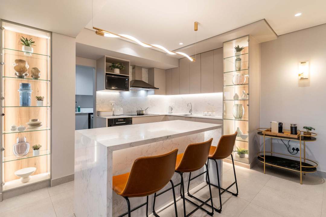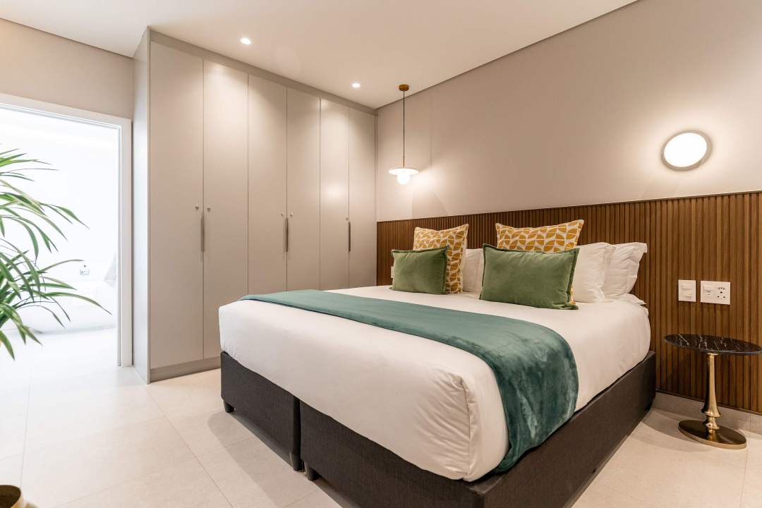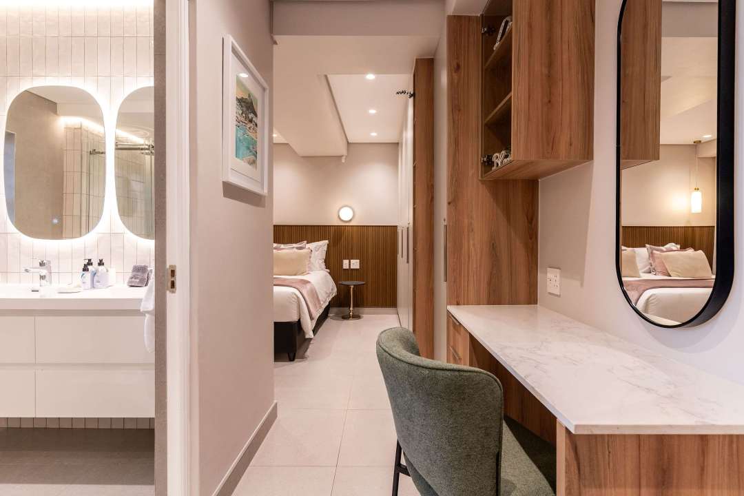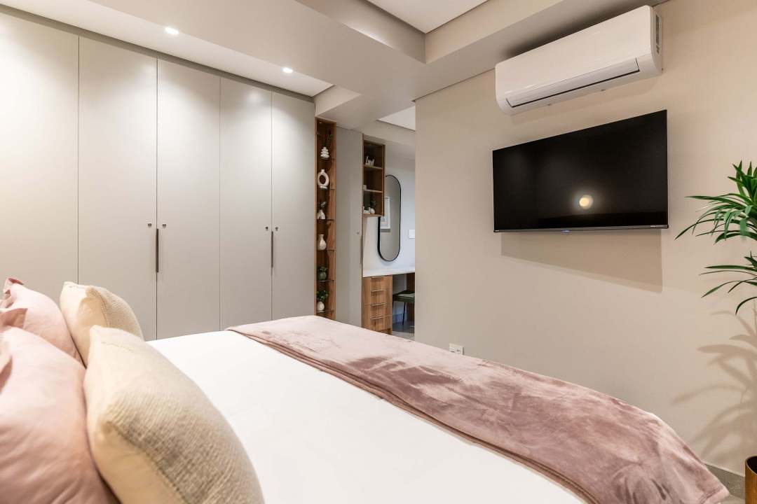 Each of the three bedrooms comes with its own en-suite bathroom. The master bedroom is a peaceful retreat complete with a mounted TV, a vanity station, and a deluxe en-suite featuring a bathtub and walk-in shower.