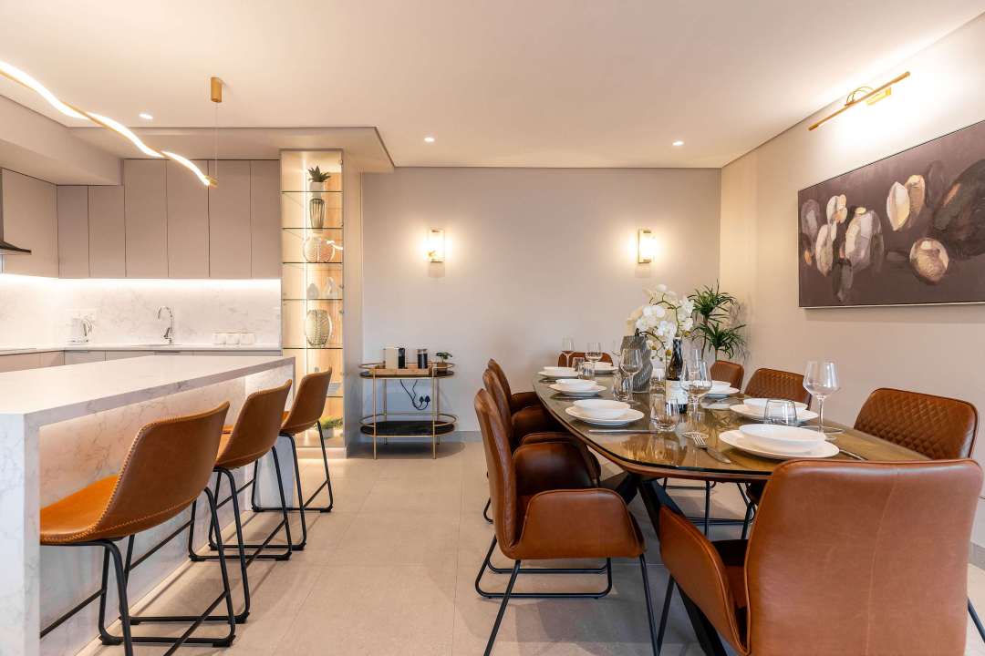 Inside, the modern, open-plan lounge features a large screen TV, air-conditioning and flows effortlessly into the dining area and a fully equipped modern kitchen, complete with high-end appliances and a separate scullery. Each of the four bedrooms has its own en-suite bathroom, with the master suite offering sweeping sea views, a mounted TV, and a spa-like en-suite with both a bathtub and walk-in shower.