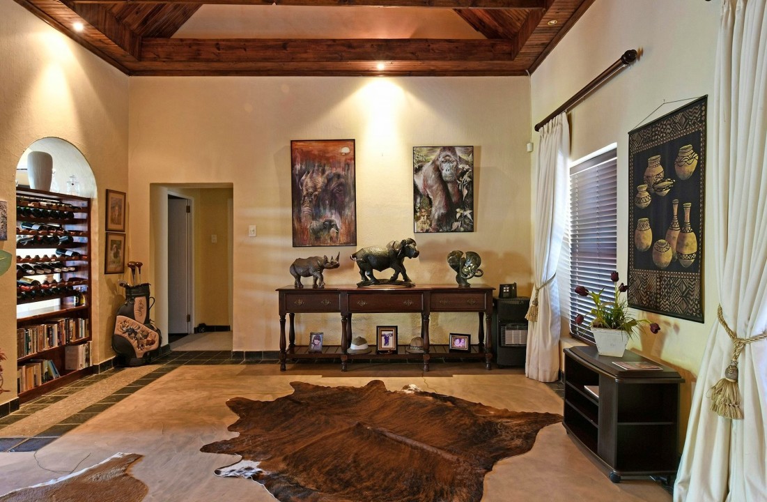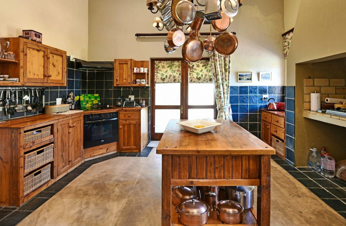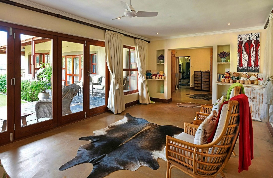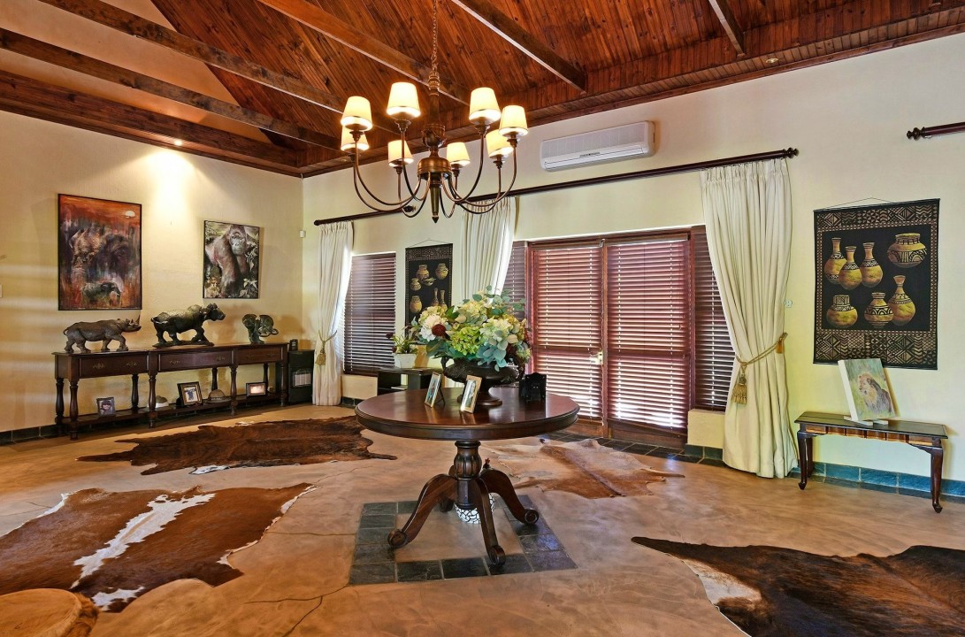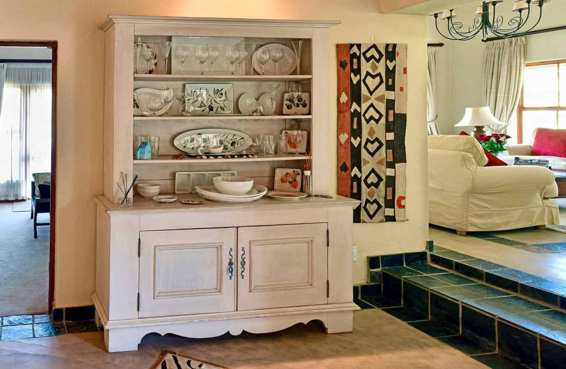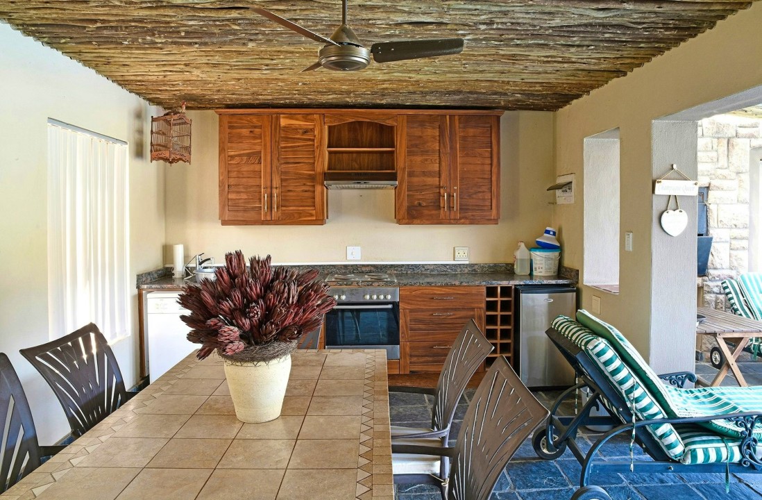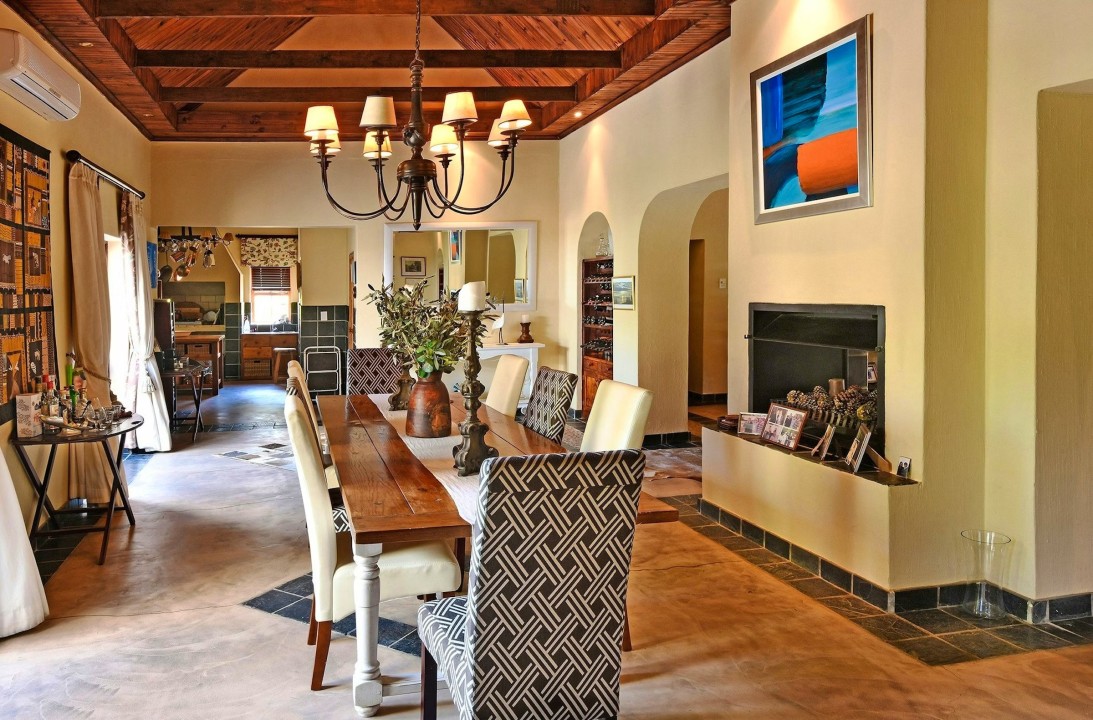 The home features a fully equipped kitchen and scullery that includes an electric stove, gas stove, oven, air fryer, microwave, kettle, toaster, cutlery, crockery, fridge-freezer, bar fridge, dishwasher, washing machine, and tumble dryer. The lounge and dining area offer comfortable seating for guests to dine and relax and also boasts a fireplace. For entertainment, a smart TV with Netflix and access to free Wi-Fi are available.