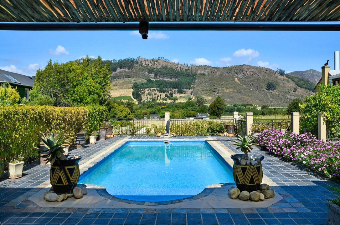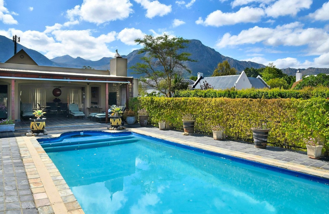 Outside, guests can enjoy a covered patio with an outdoor kitchen and built-in braai. Additionally, a swimming pool and outdoor shower complete this space. Guests are afforded secure garage and driveway parking behind a secure gate. This property is just a short walk from Franschhoek’s shops and restaurants, only 150 m from the Franschhoek Wine Tram Terminal, and 500 m from the bustling Franschhoek Market.