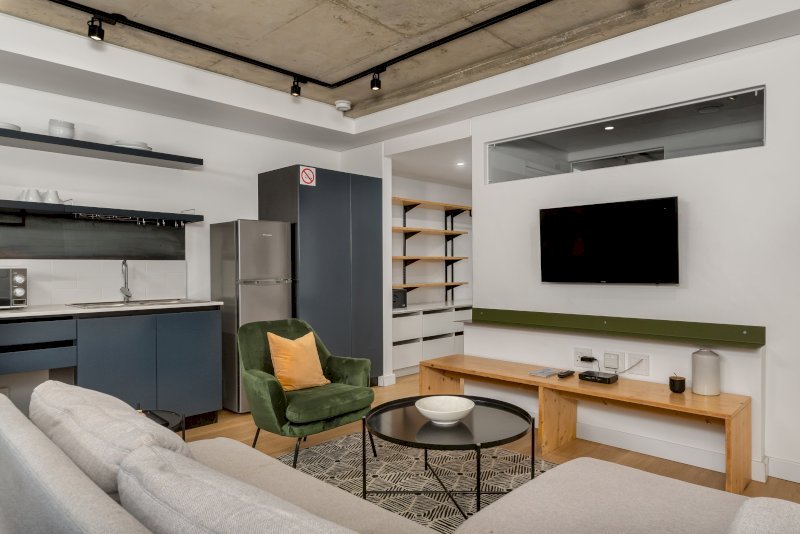 The living space is designed for comfort and convenience, featuring a Smart TV with Netflix and comfortable seating for relaxing evenings.