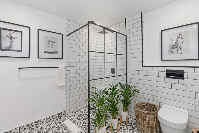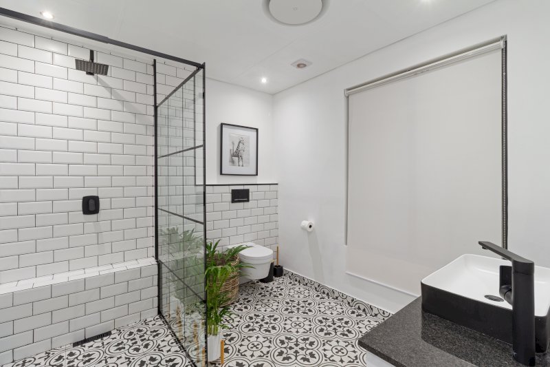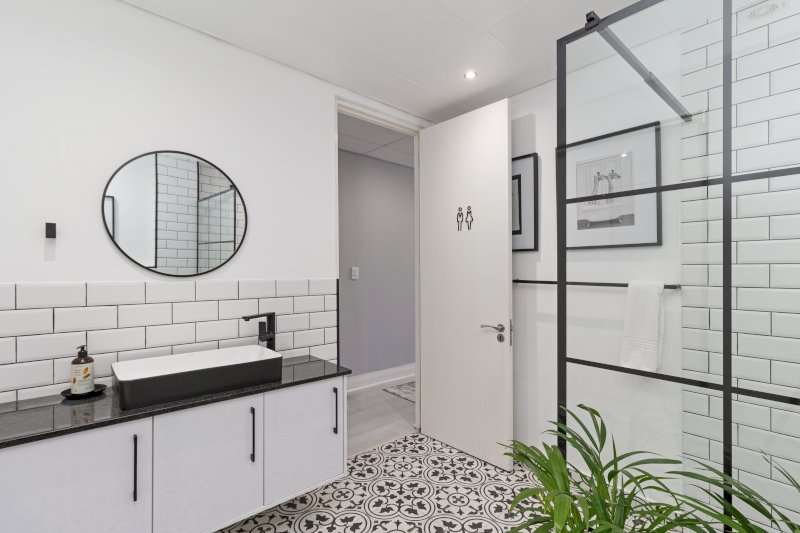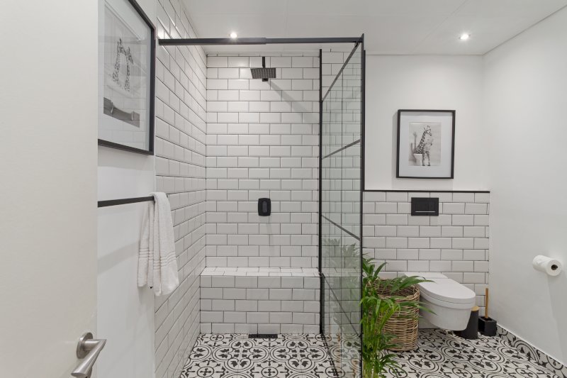 The separate sleek, designer bathroom is fitted with a modern walk-in shower, offering both style and functionality to refresh after a day of exploring Cape Town’s beautiful coastline and vibrant surroundings.