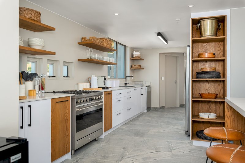 The kitchen is fully equipped and fitted with high-end appliances, a separate scullery and a large central island. A Nespresso machine, Smeg Gas Range and gorgeous views makes this kitchen any chef’s dream.