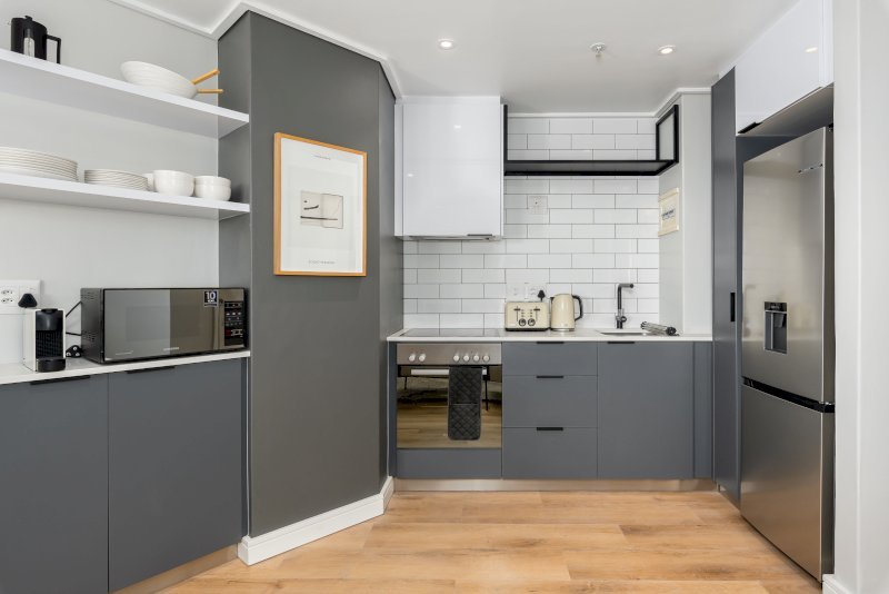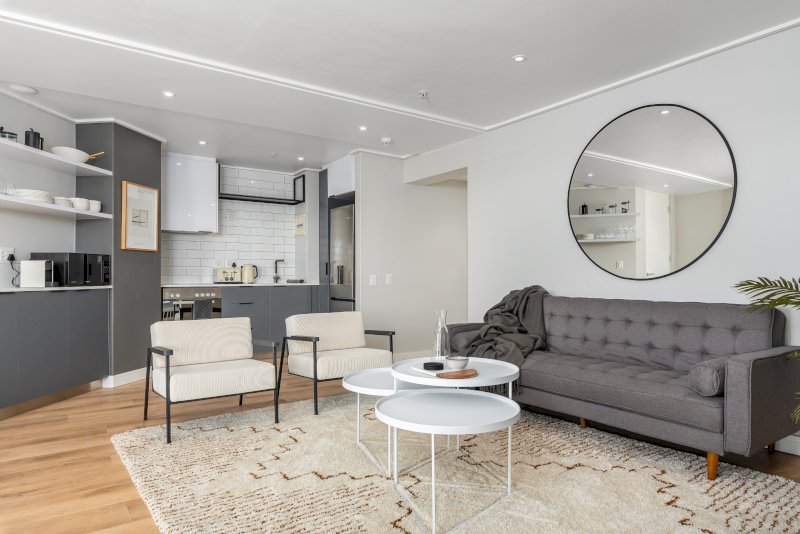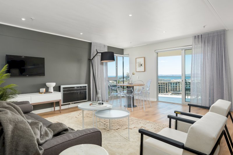 The open-plan living area is thoughtfully designed to maximise comfort and light. Relax with your favourite shows on the TV with Netflix, or open the doors to the spacious balcony and let the city and sea views become part of your living space. The flow between indoors and outdoors enhances the feeling of space and connection to Cape Town’s iconic setting.
