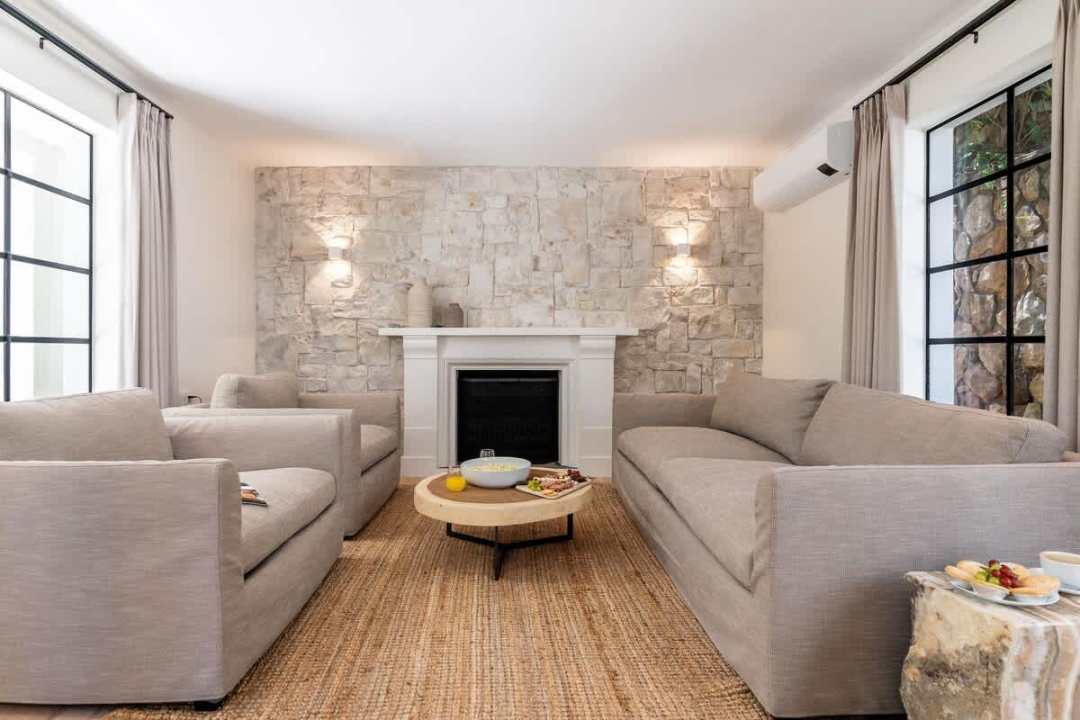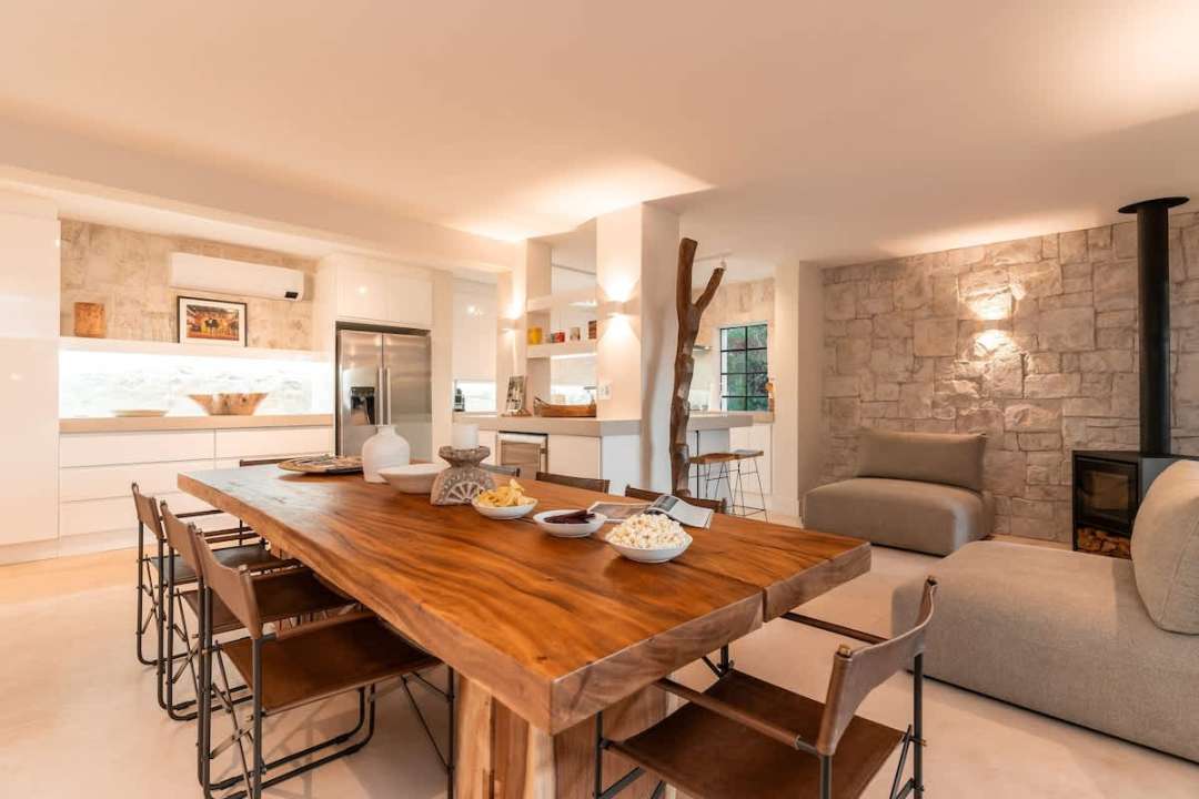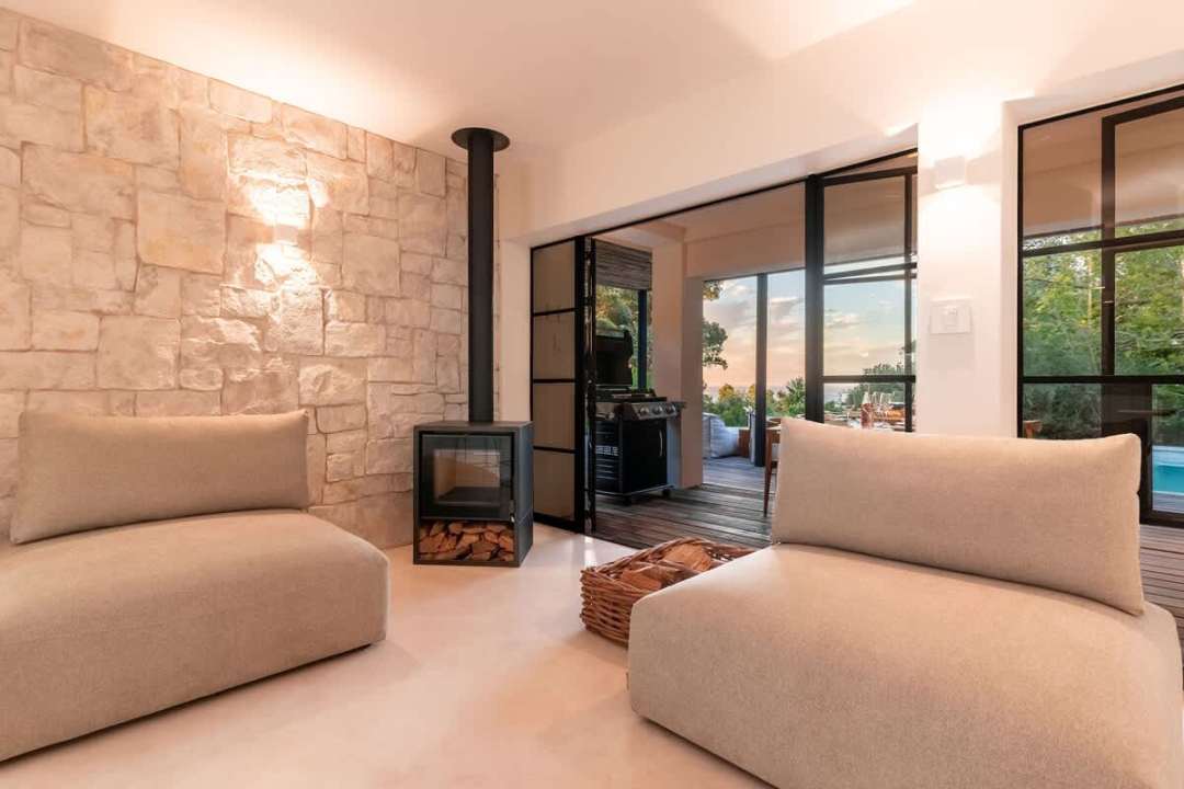 Inside, the serenity continues with a thoughtfully designed living area that exudes comfort and calm. Plush seating, a decorative fireplace, and a large-screen TV create a cozy space for relaxation, enhanced by the gentle murmur of the stream. Adjacent is the open-plan dining room and kitchen, where modern elegance shines. Floor-to-ceiling windows bathe the space in natural light, blending indoor and outdoor living. The 10-seater dining table, second fireplace, and fully equipped kitchen with a separate scullery ensure effortless entertaining and everyday convenience.