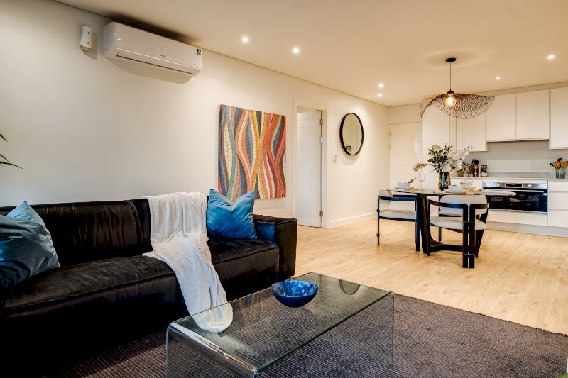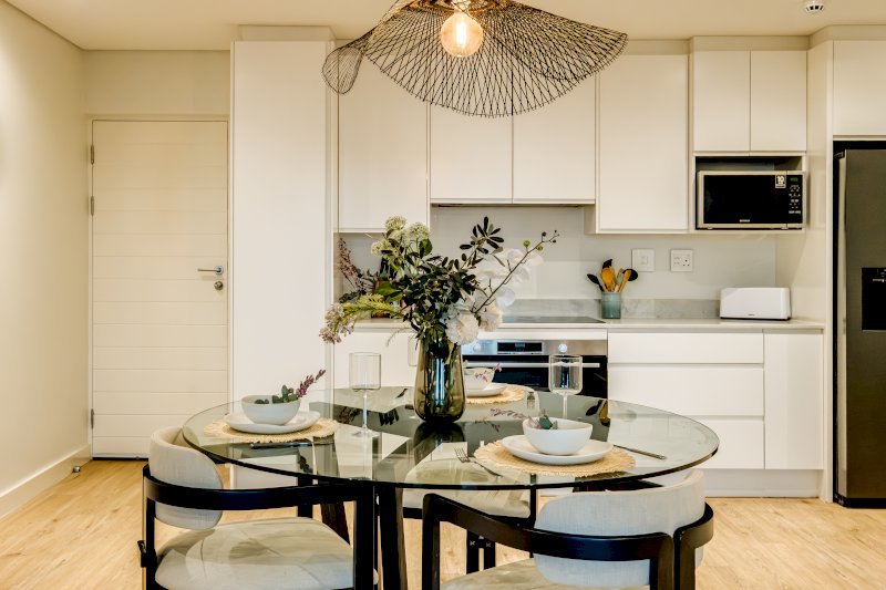 The open-plan lounge flows onto an expansive balcony with dining for six and a relaxed outdoor seating area, ideal for meals, morning coffees, or sundowners with panoramic views of Cape Town’s southern suburbs. Inside, unwind on the leather sofa and enjoy the large smart TV, or gather around the sleek dining table for meals prepared in the fully equipped kitchen.