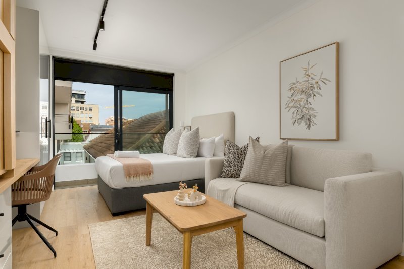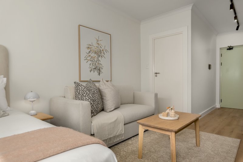 Thoughtfully designed for couples, friends, solo travellers, and business guests, the studio combines style with practicality, creating a warm and welcoming home away from home. The cosy bedroom area features a queen-sized bed dressed for restful nights, while the lounge includes a comfortable sofa, designer finishes, and glass doors opening onto a private balcony—an inviting spot for morning coffee or evening reflection.