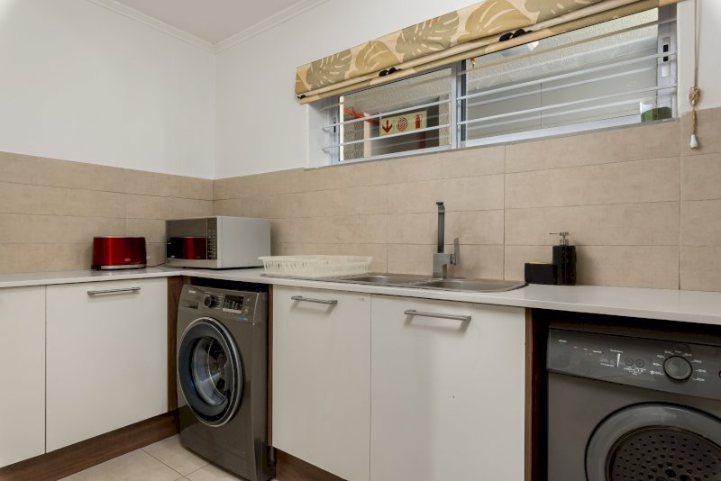 The open-plan kitchen and living area make this apartment feel bright and expansive. The kitchen is fully equipped with modern appliances, cutlery, and cookware—perfect for preparing meals at your own pace. A separate scullery adds extra convenience and keeps the main kitchen area organized.