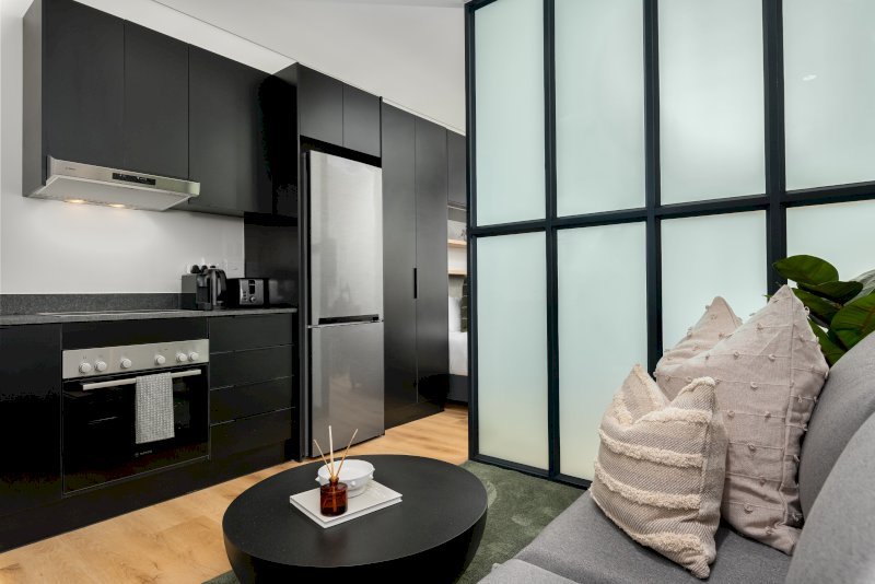 The interior is clean and contemporary, with a carefully considered layout that maximises space and functionality. A fully equipped kitchen integrates seamlessly with the living and sleeping area, while a dedicated desk space supports remote work or extended stays.