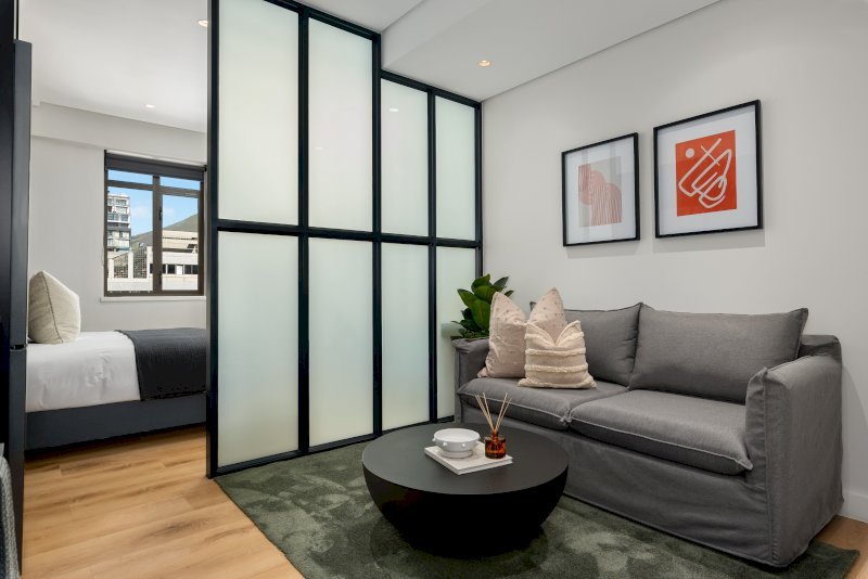 Positioned in the energetic heart of the city, this studio balances urban vibrancy with refined simplicity. Large windows draw in natural light while overlooking the movement of the streets below, creating a sense of connection to Cape Town’s dynamic centre.