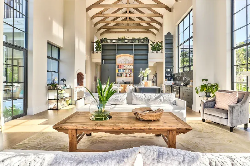 Indoor spaces are voluminous, both in height and breadth. Double volume floor to ceiling glass windows allow an abundance of natural light to stream in. Décor is immaculate and inviting, understatedly plush in muted tones of beige and grey, complemented by original artifacts and layered with splashes of colour in a considered selection of curated furniture, throws, scatter cushions, and rugs.