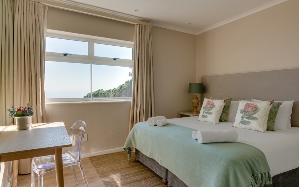 Queen size bed with sea and mountain views, en-suite bathroom with walk in shower, TV.