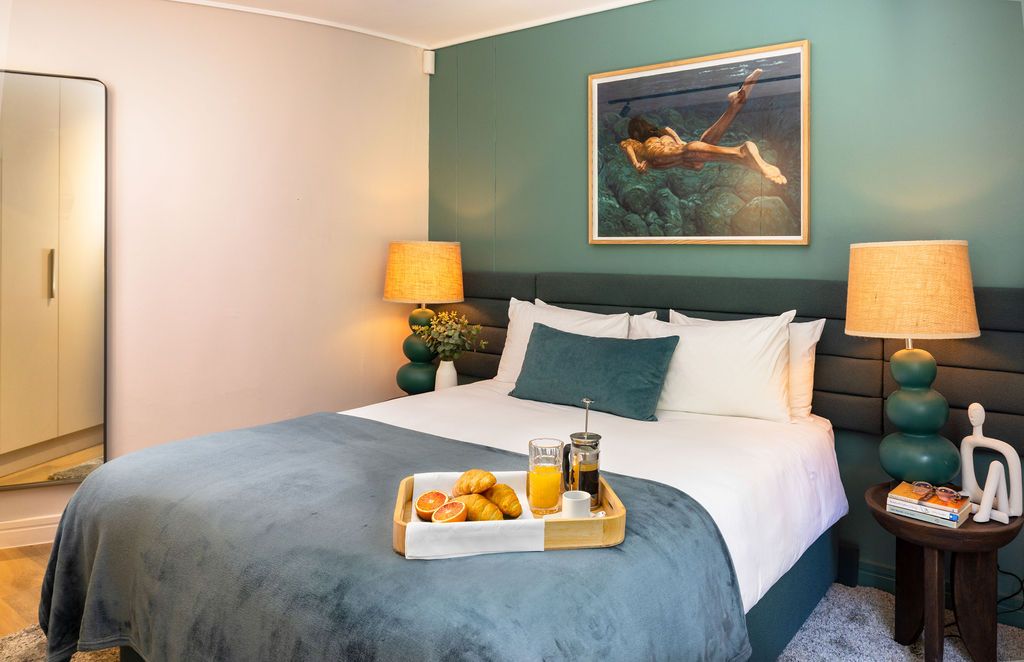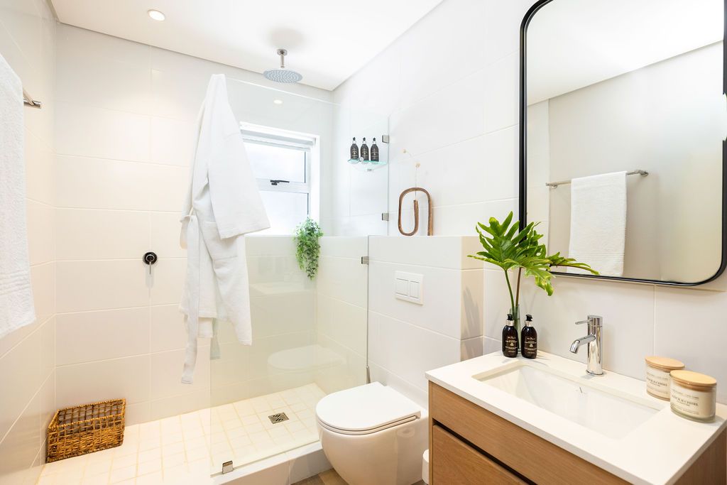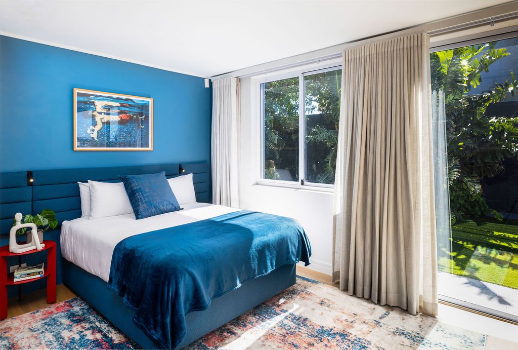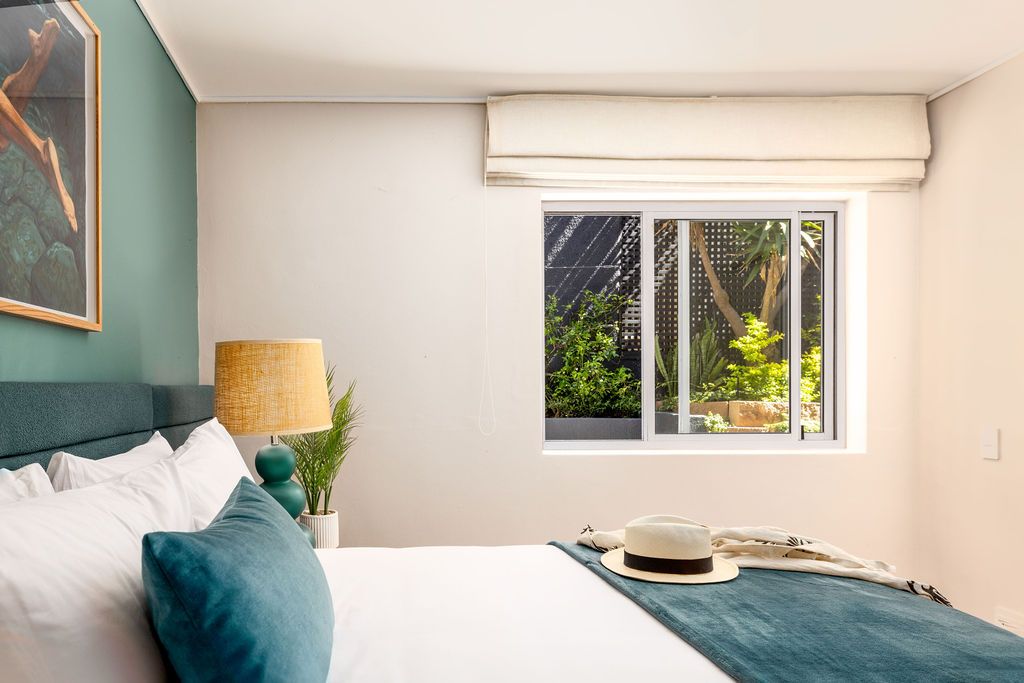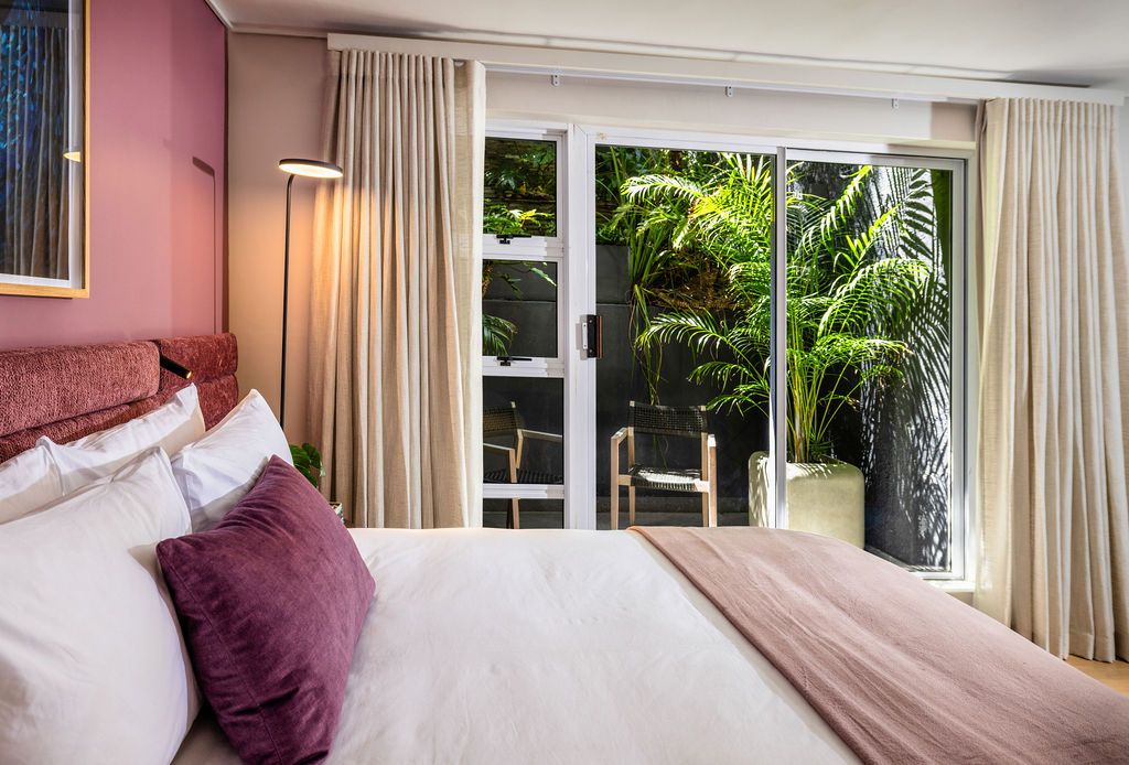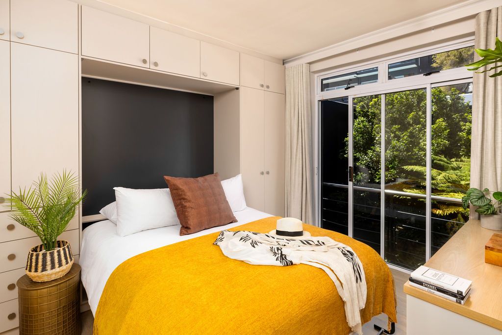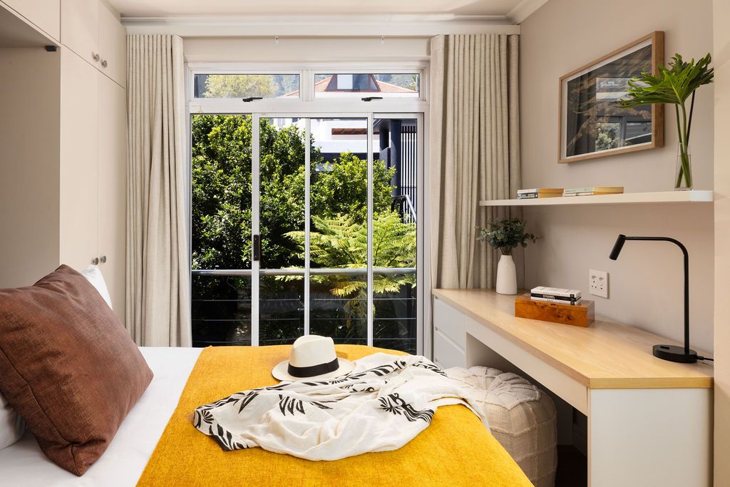 Bedroom 2 – Queen size bed, dedicated bathroom with a shower. Sliding door leads to small courtyard and garden view.
