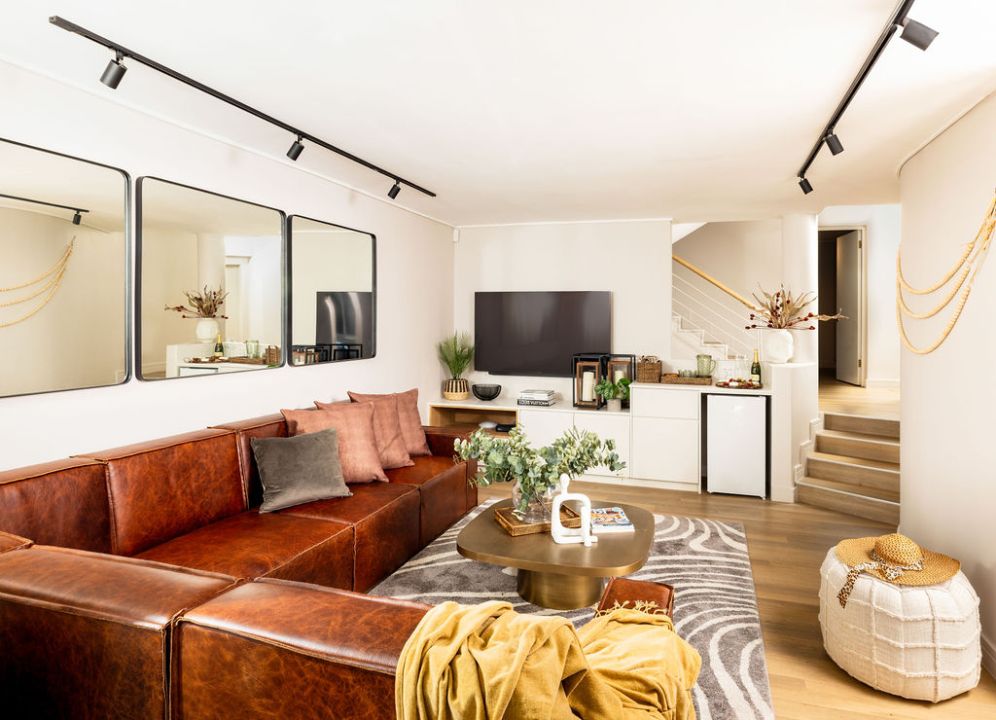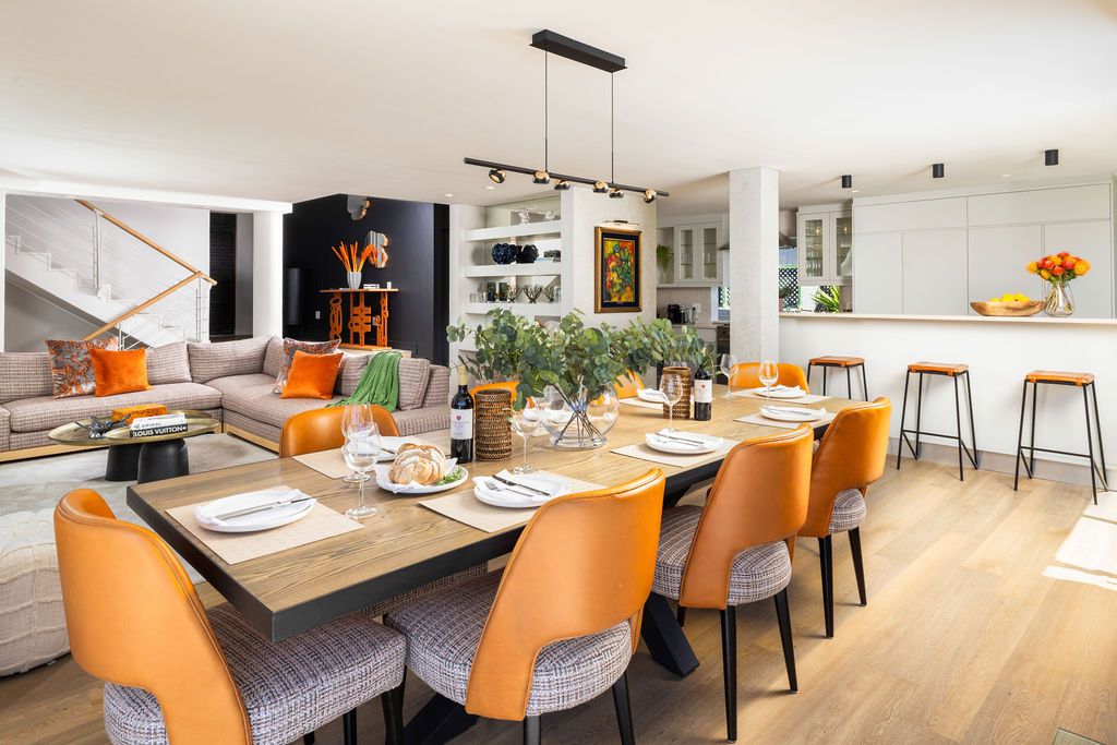Open plan lounge with 63-inch Smart TV and large L-shaped couch
