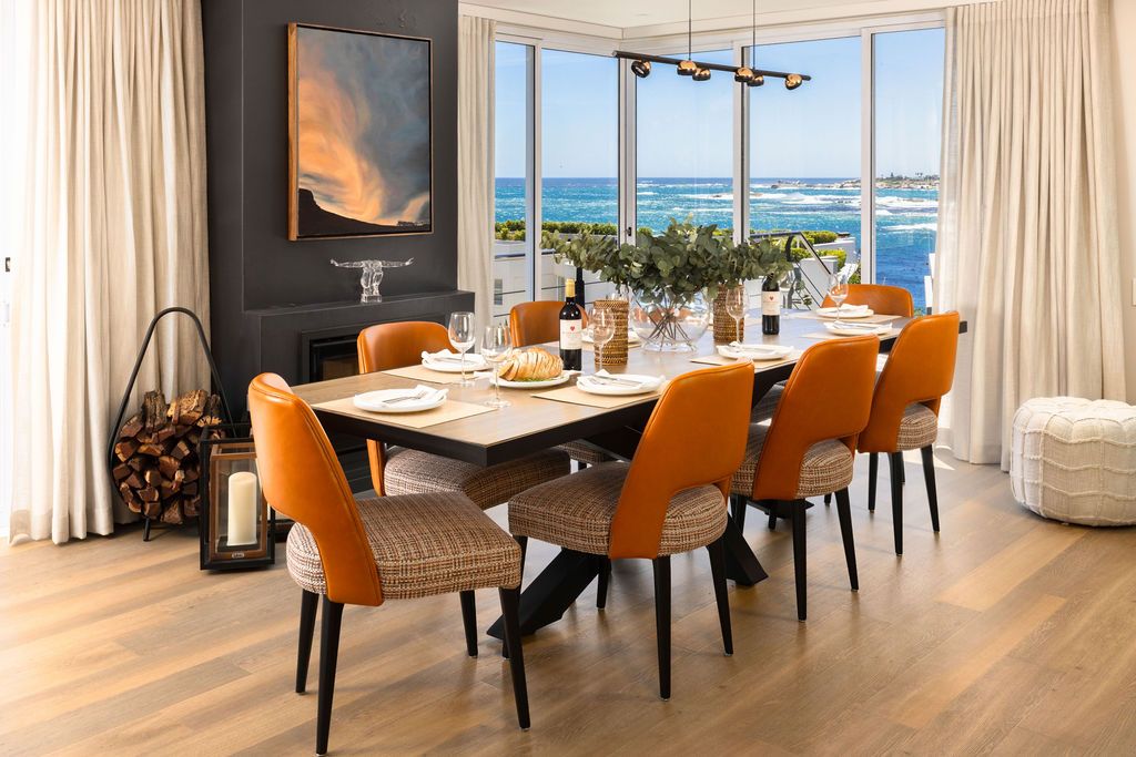Open plan dining area with 10-seater dining table and wood-burning fireplace, sliding door leads to pool and patio, Sea views