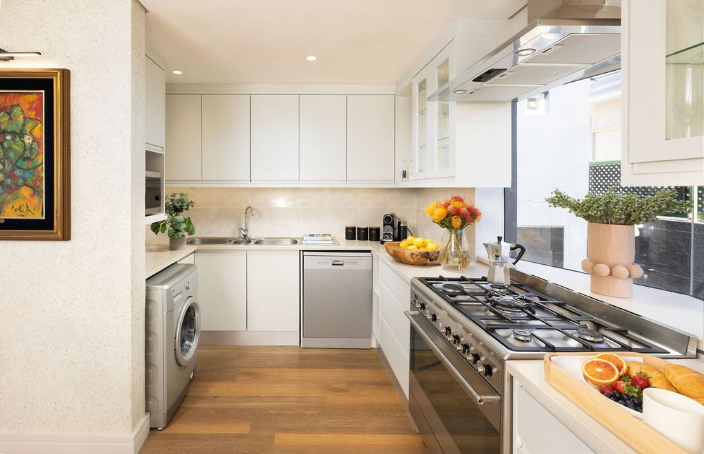 Open plan kitchen with gas hob, electric oven, Nespresso machine, kettle, toaster, dishwasher, washing machine, microwave, and double door fridge. (tumble dryer in garage).