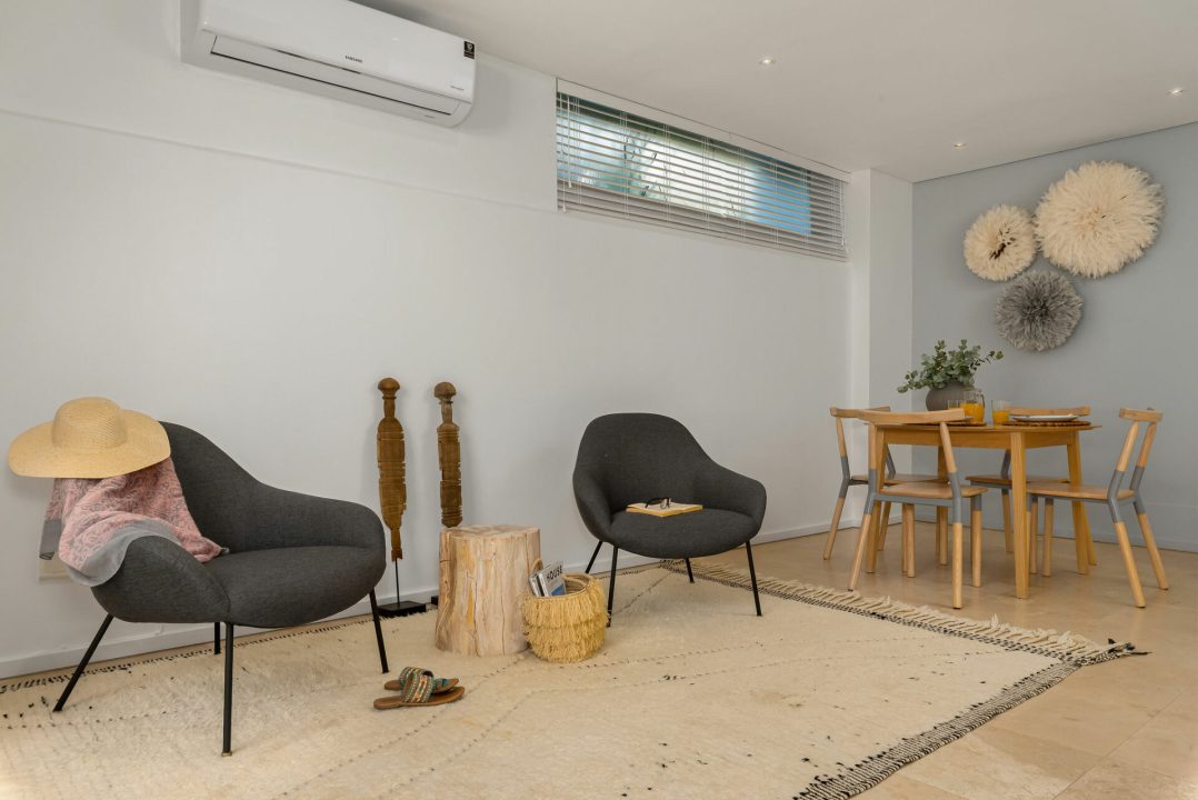 King size bed (can be separated into twins), 4-seater dining table and small lounge area, garden views, en-suite bathroom with walk in shower , sliding doors open up to patio with 6-seater dining table, 2 sun loungers and access to lush garden