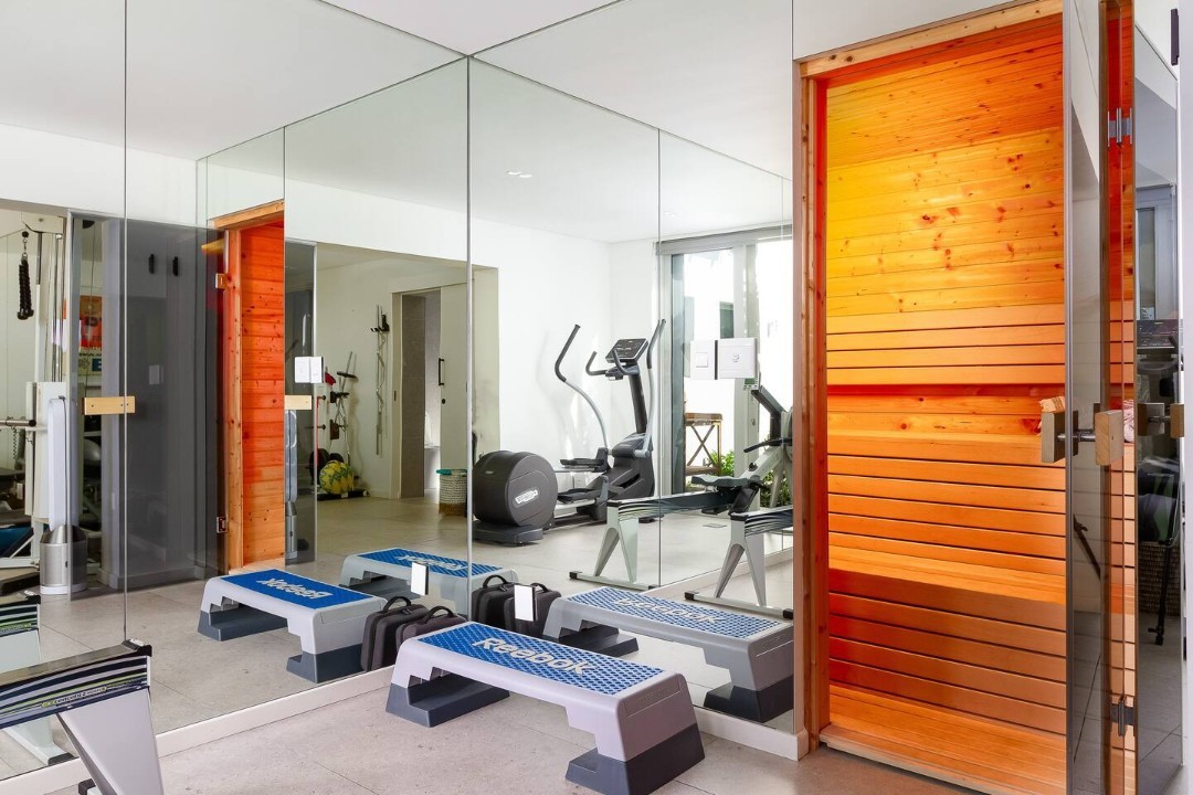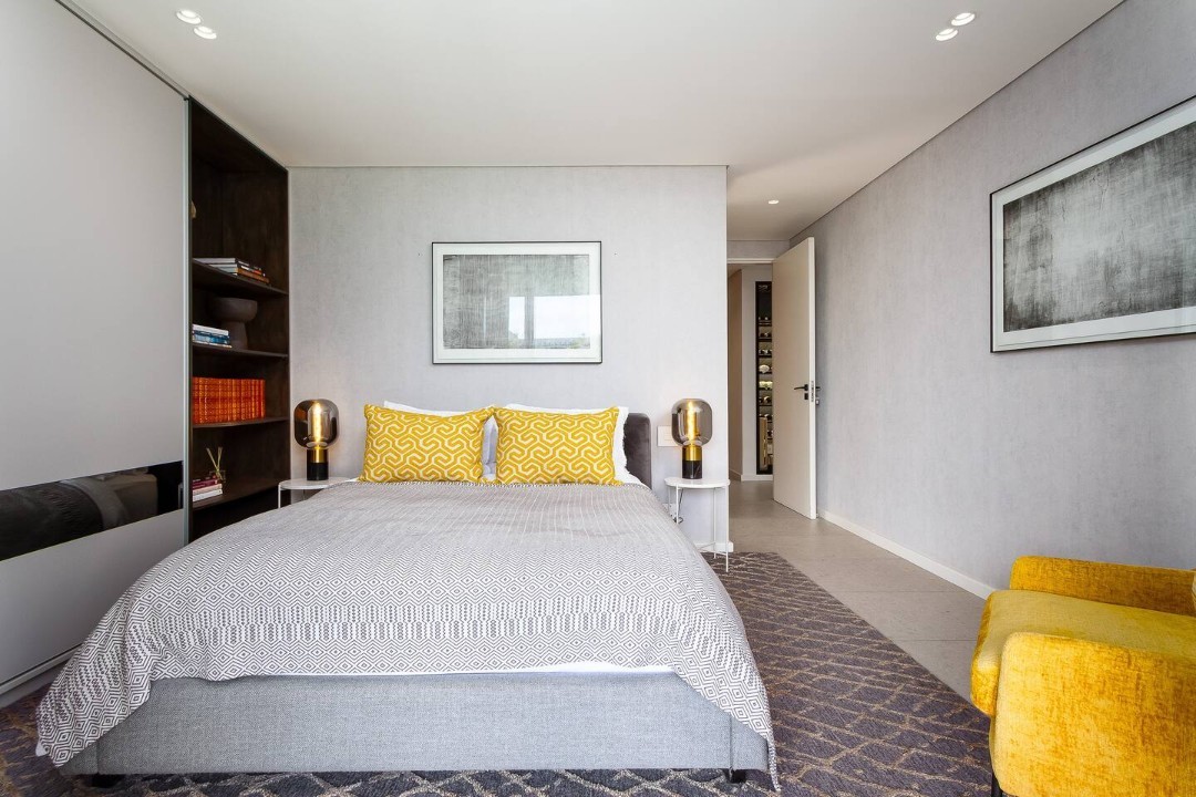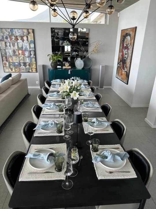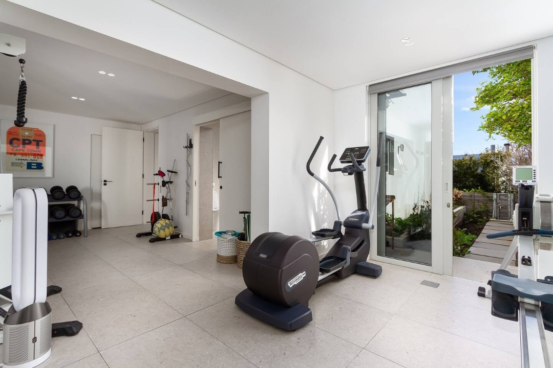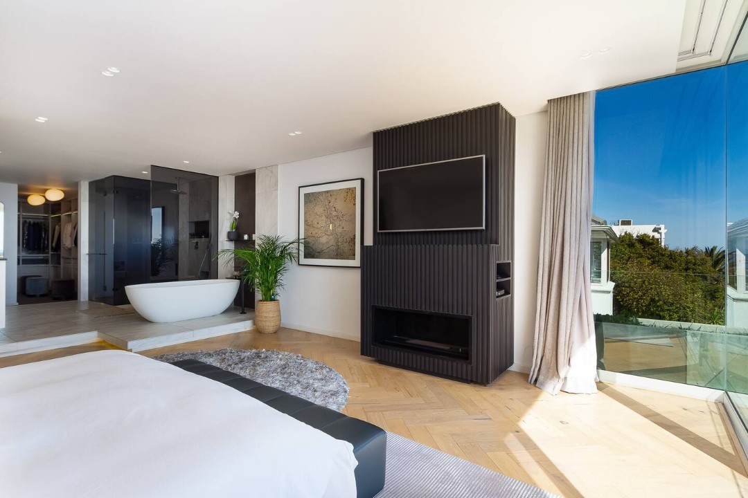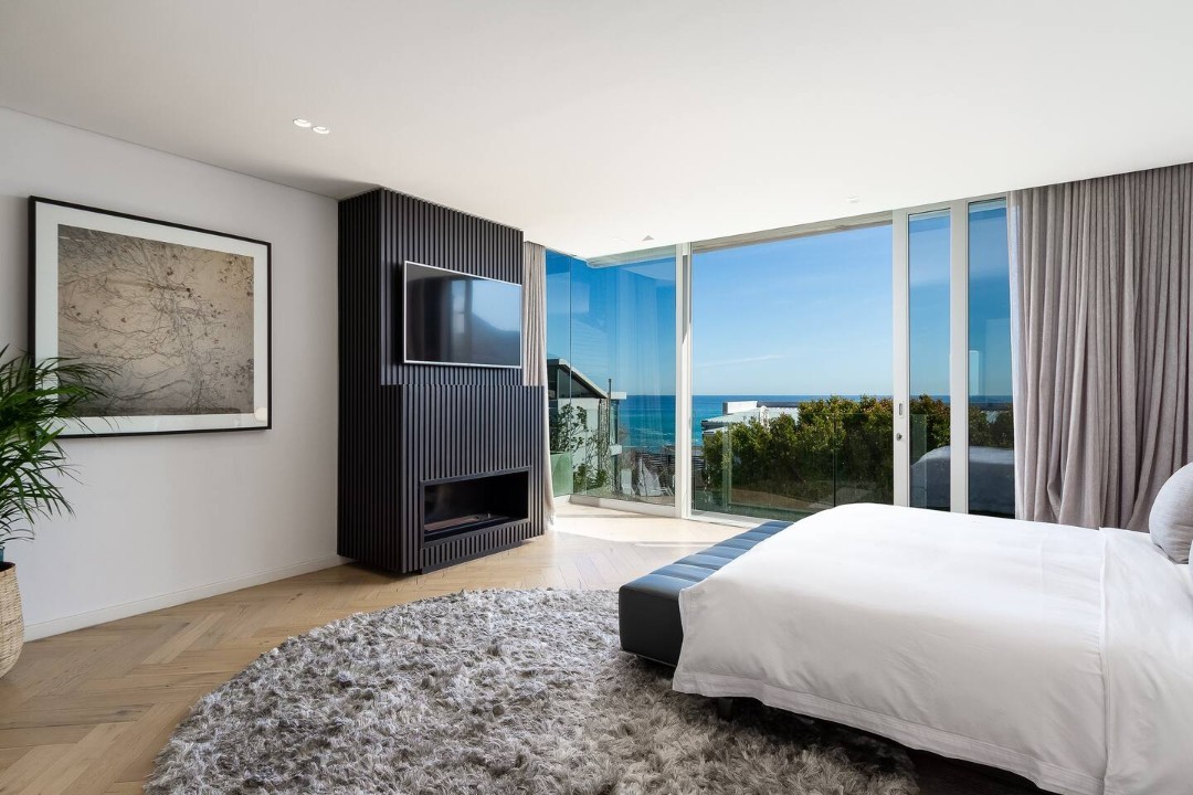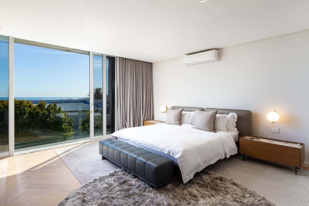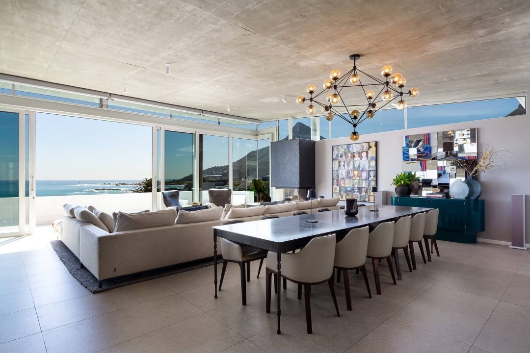 The top level living area opens out onto an expansive terrace with breath-taking panoramic Atlantic views. The spacious living room features bespoke contemporary furniture and an imposing 12-seater dining table. The kitchen features separate cooking and prep areas equipped to the highest standards with Miele appliances throughout. The centre level houses three of five spacious bedrooms, each with its own captivating view. The elegant master suite has a super king bed, a spacious dressing area and bathroom with a large walk-in shower and free standing bath. There are two further queen bedrooms on this level and a family bathroom. The fourth queen bedroom with ensuite bathroom is located on the lower level. The lower level features a home cinema, fully-equipped gym and sauna as well as a utility room complete with laundry, dishwasher and ice maker. The exterior is no less impressive, with a covered veranda/entertainment/braai area, 12-seater outdoor dining table, refreshing swimming pool and garden scented with lavender, rosemary and frangipani. Exquisite modern finishes, beautiful artwork, high ceilings, large windows and a neutral palate combine to create a genuinely magnificent, light-filled, serene and beautiful sanctuary. The house has a full-time live-in housekeeper, direct access garage and excellent security features for complete peace of mind. Villa Pitlochry is situated in an elevated position, providing privacy and ample space for entertaining, relaxing and easy living, a short walk from Table Mountain nature reserve, as well as the sandy beaches, restaurants and cafes of Camps Bay. Stunning views, sea breeze, luxury finishes and impeccable attention to detail make this the perfect home away for an unforgettable holiday, ideal for family or friends.