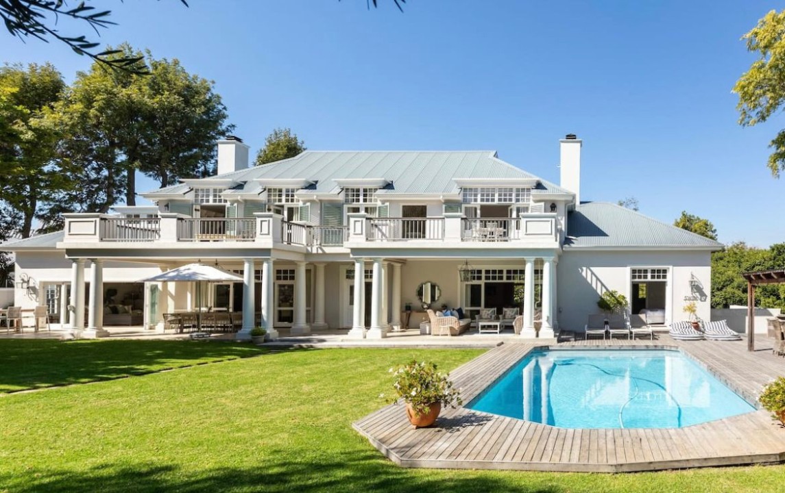 Outdoor living is at the heart of this Constantia villa. Guests can enjoy two swimming pools, sun-drenched patios, and multiple deck areas ideal for alfresco dining or relaxed afternoons. Surrounded by greenery and framed by mountain views, the outdoor spaces provide a peaceful escape for all ages.