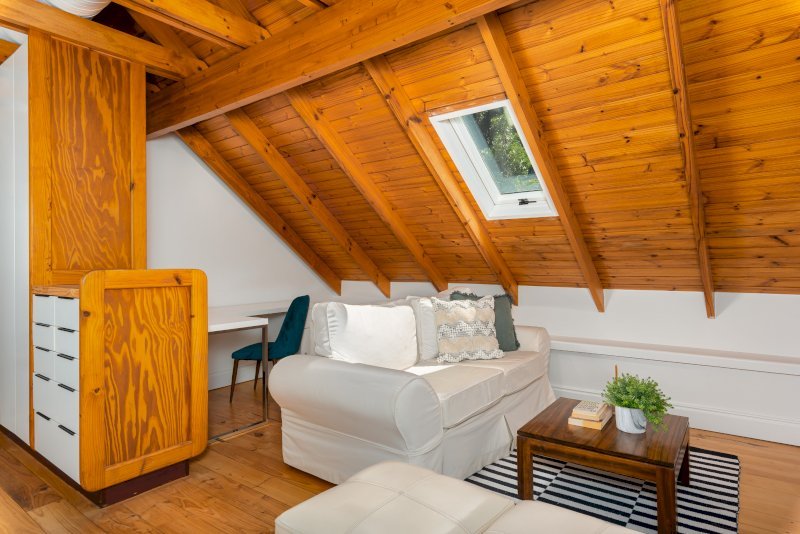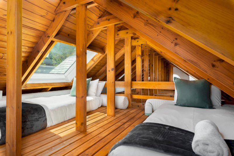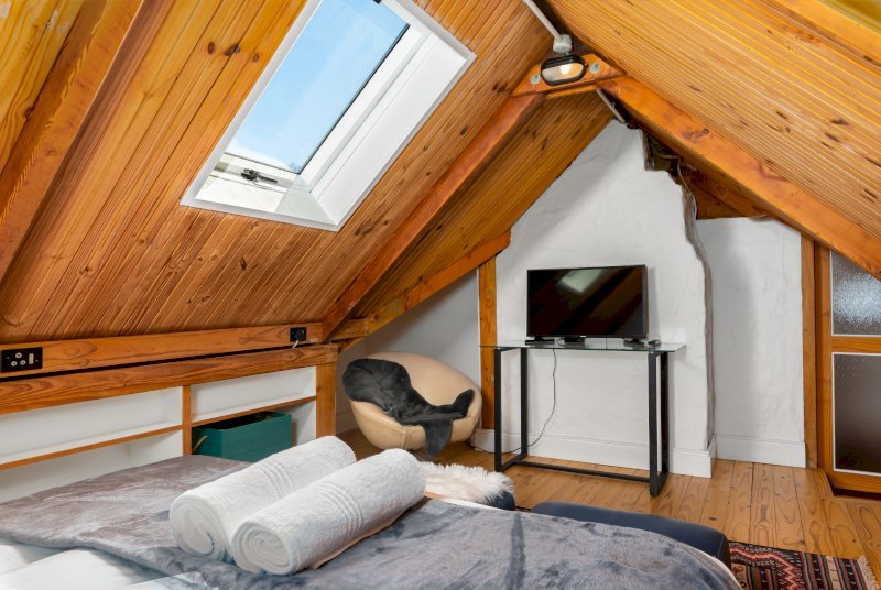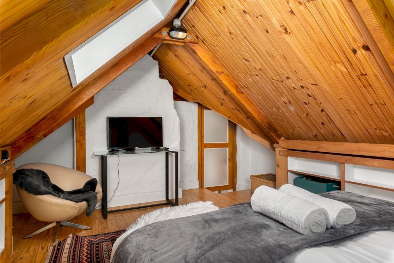 The upper level offers 2 bedrooms, a shared bathroom and second TV lounge with a study area complete with an L-shaped desk and a reading nook overlooking the lounge on the level below. An added bonus is the loft space in the second bedroom upstairs with 2 single beds (this loft area is open to the rafters above).