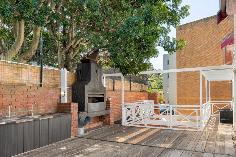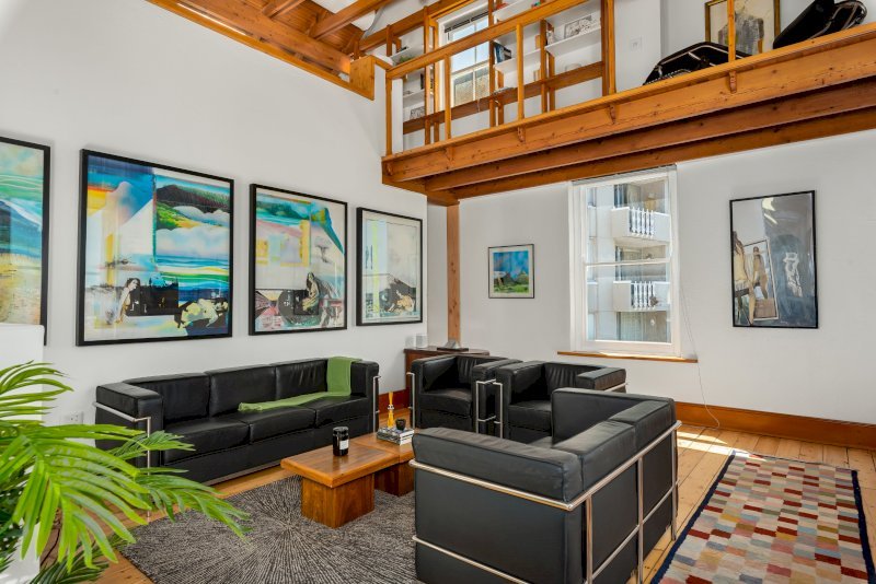 Up the stairs to the main level you will find a dining room with loads of natural light and a combustion fireplace for evenings where you want to create a cosy dining experience. The double volume lounge area with a fireplace and carefully curated art is on the same level as well as a large kitchen that leads to an outside patio with a braai.