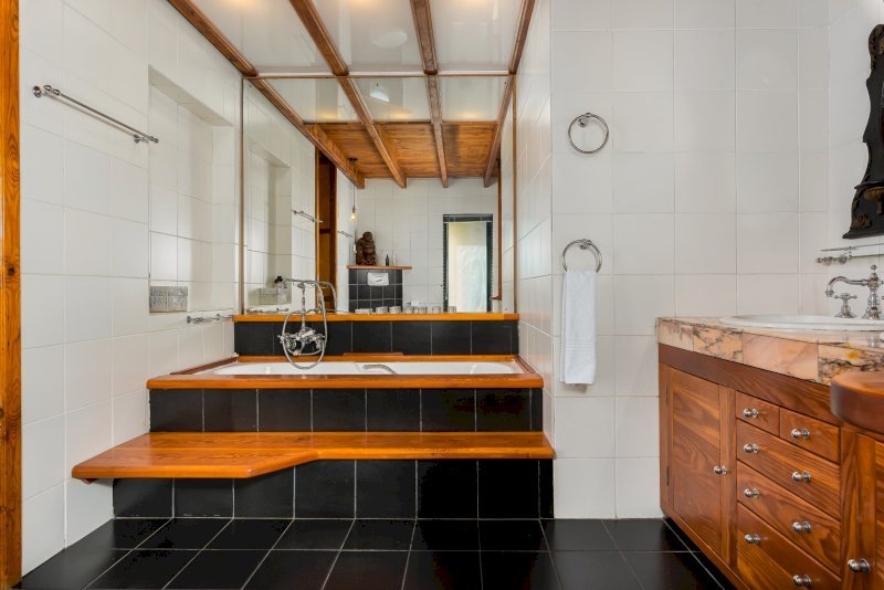 Also on the main level you will find the main bedroom complete with a canopy bed, views over the city bowl and doors to the patio to let in fresh air. The ensuite bathroom offers a walk-in shower and oversized tub with marble finishes and a double basin completing the space.