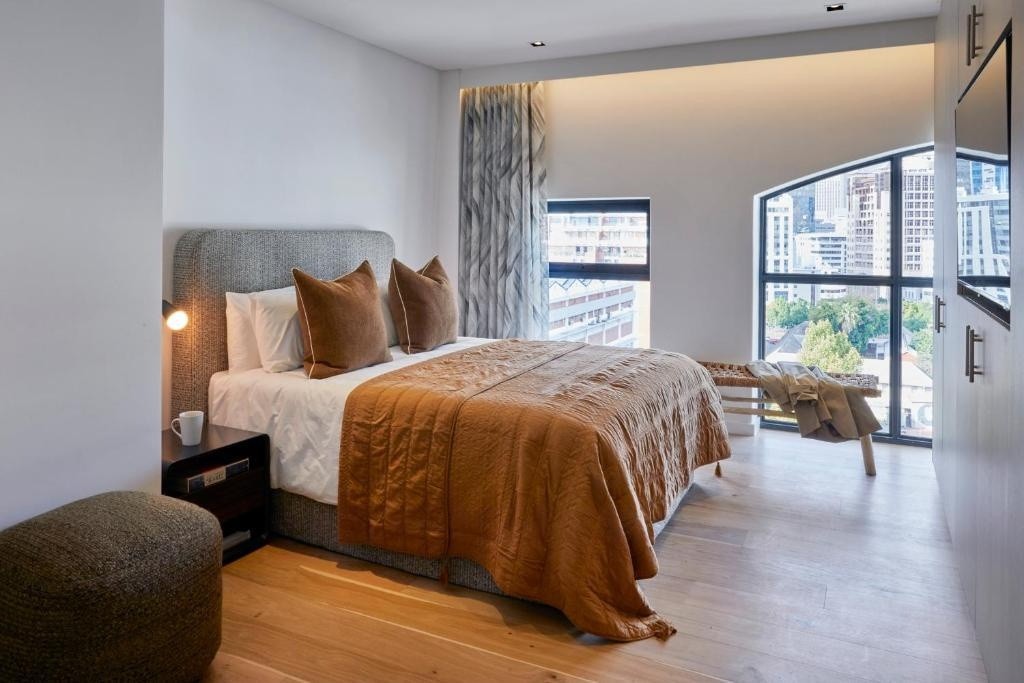 Private balconies or terraces extend the living space outdoors, framing spectacular skyline, ocean, or mountain views. Guests also enjoy access to the communal swimming pool — perfect for cooling off under the Cape Town sun.